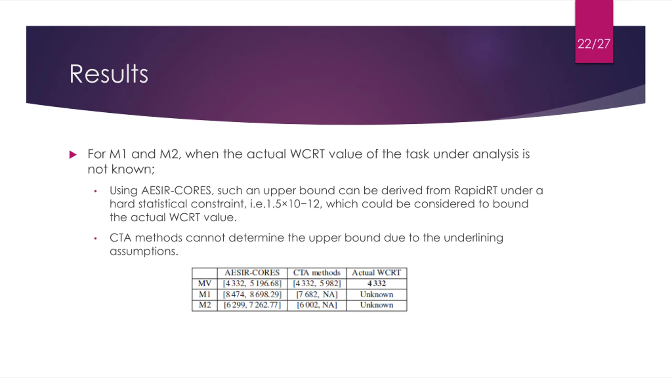 22/27 Results For M1 and M2, when the actual WCRT value of the task under analysis is not known; Using AESIR-CORES, such an upper bound can be derived from RapidRT under a hard statistical constraint, i.e.1.5 10 12, which could be considered to bound the actual WCRT value. CTA methods cannot determine the upper bound due to the underlining assumptions.