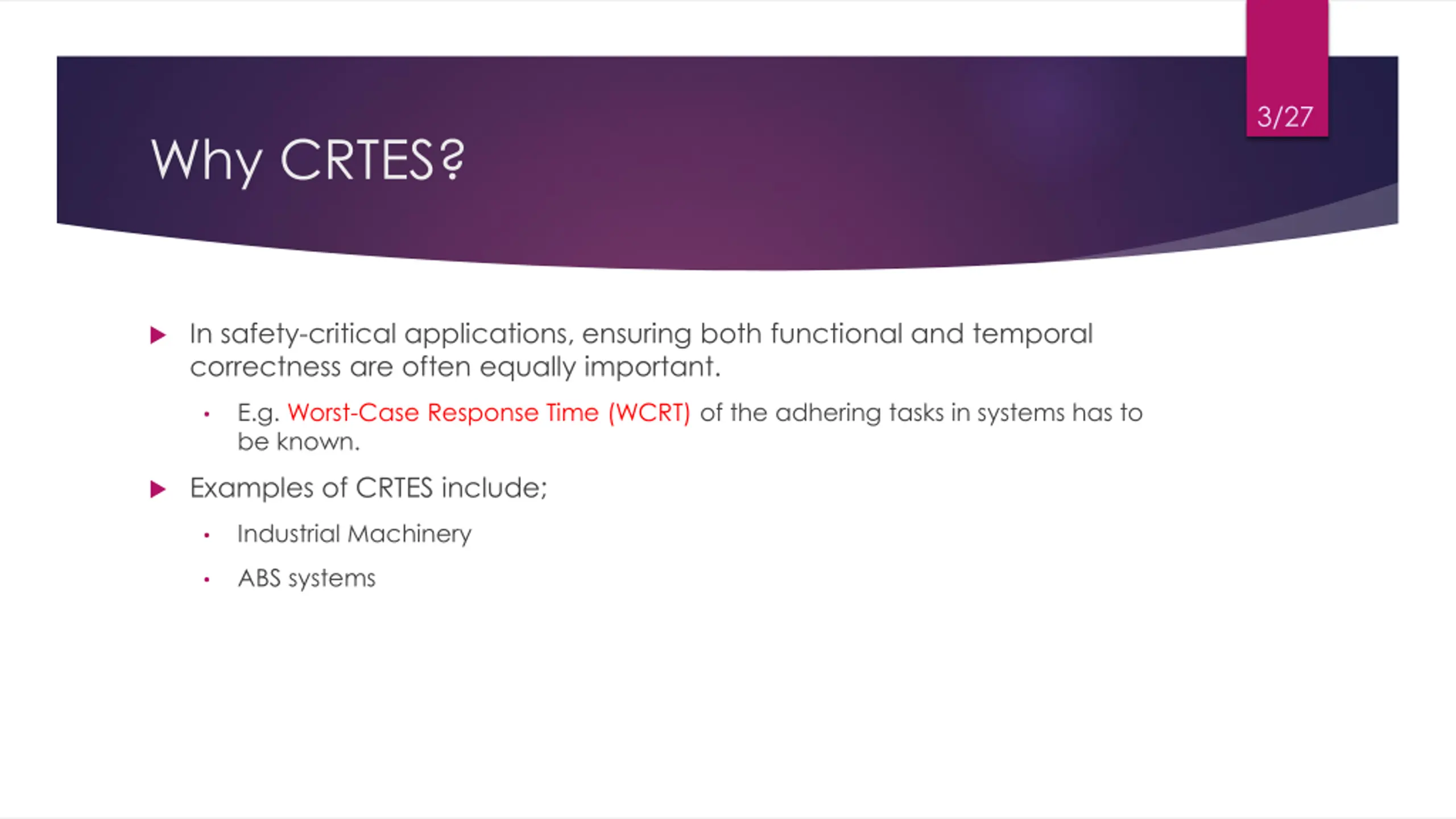 3/27 Why CRTES? In safety-critical applications, ensuring both functional and temporal correctness are often equally important. E.g. Worst-Case Response Time (WCRT) of the adhering tasks in systems has to be known. Examples of CRTES include; Industrial Machinery ABS systems
