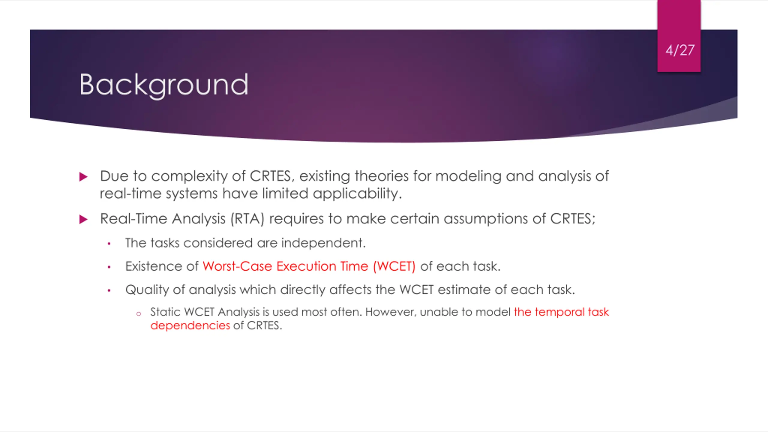 4/27 Background Due to complexity of CRTES, existing theories for modeling and analysis of real-time systems have limited applicability. Real-Time Analysis (RTA) requires to make certain assumptions of CRTES; The tasks considered are independent. Existence of Worst-Case Execution Time (WCET) of each task. Quality of analysis which directly affects the WCET estimate of each task. o Static WCET Analysis is used most often. However, unable to model the temporal task dependencies of CRTES.