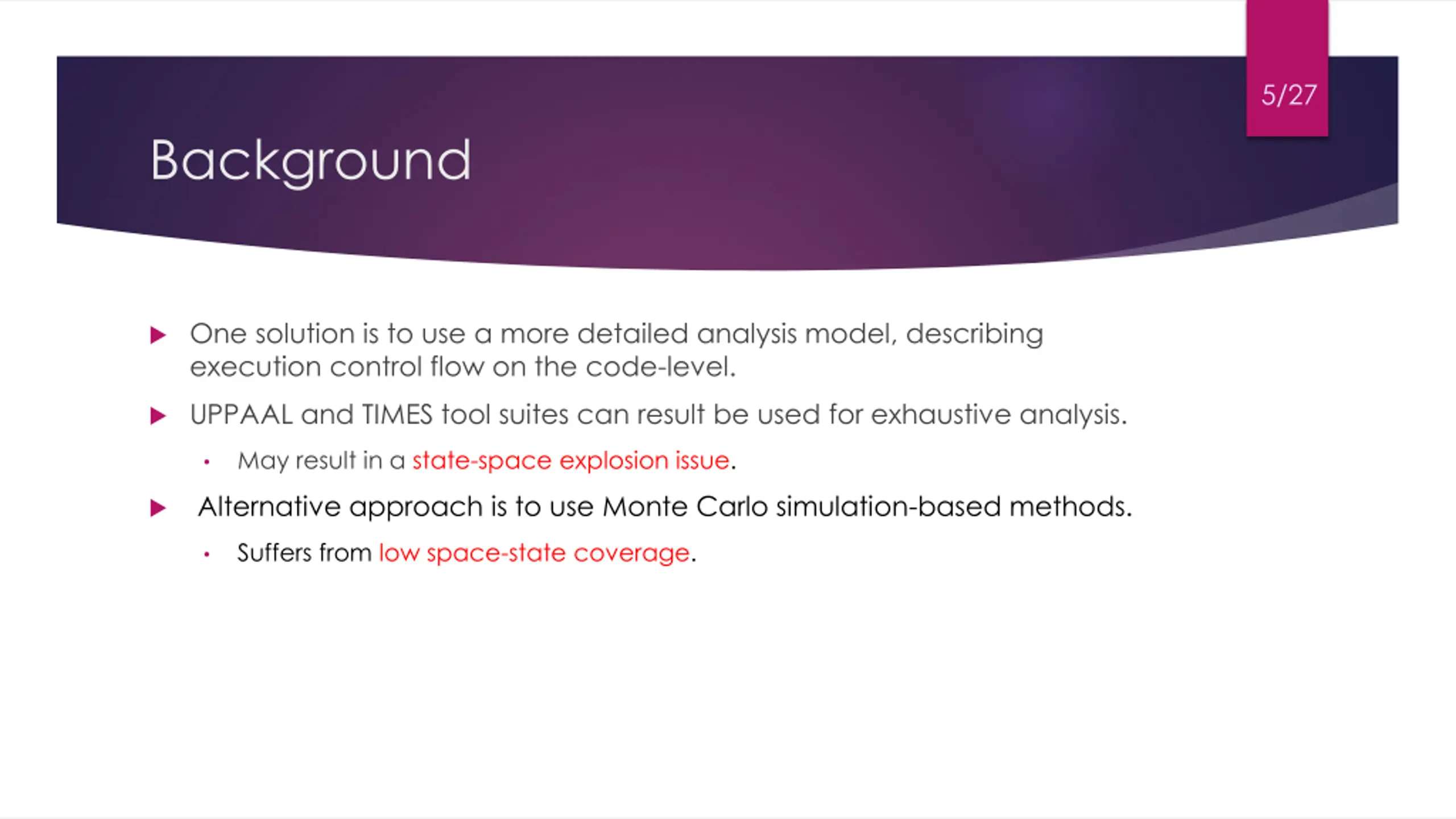5/27 Background One solution is to use a more detailed analysis model, describing execution control flow on the code-level. UPPAAL and TIMES tool suites can result be used for exhaustive analysis. May result in a state-space explosion issue. Alternative approach is to use Monte Carlo simulation-based methods. Suffers from low space-state coverage.