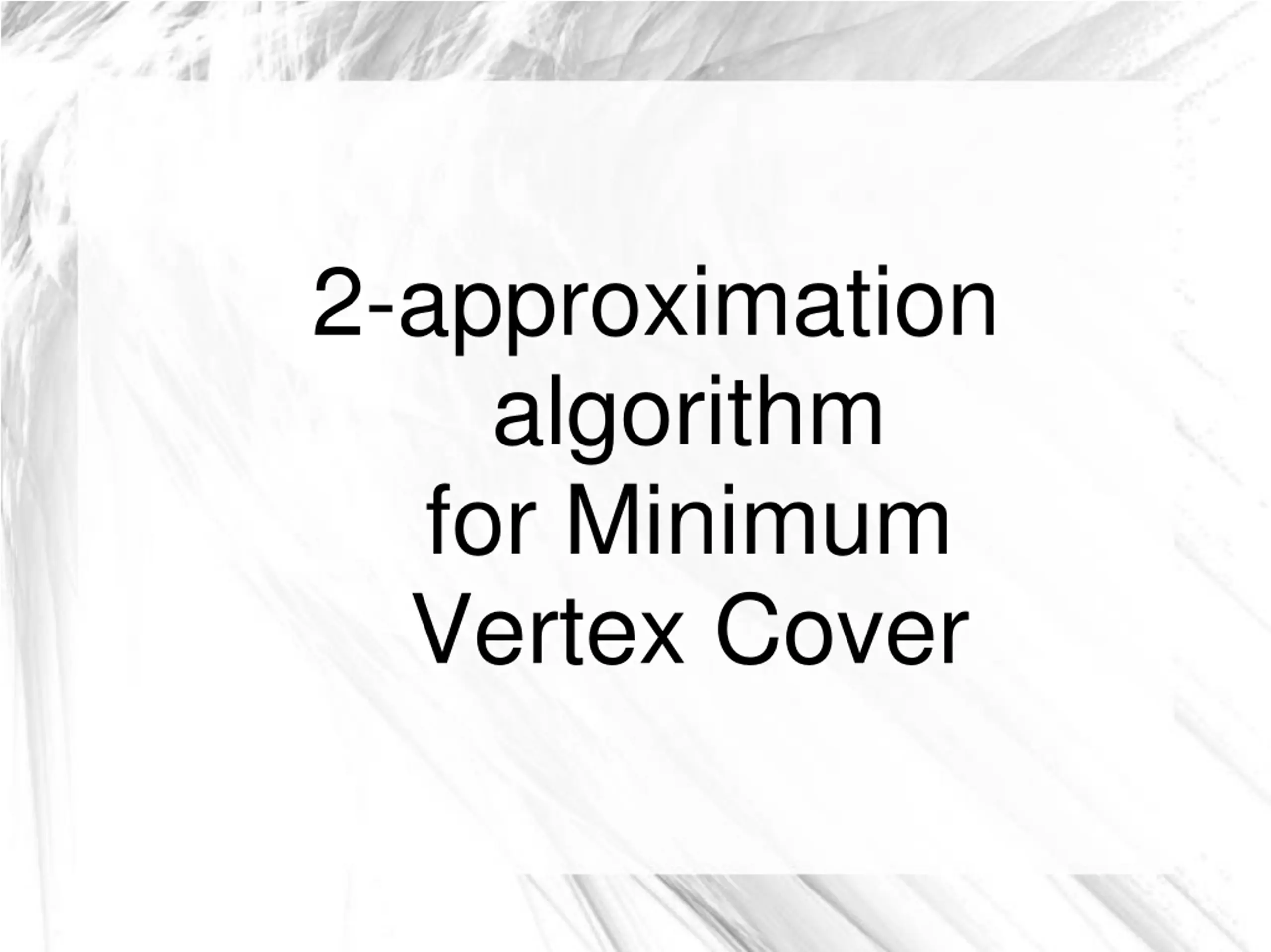 The Min Vertex Cover Problem Input: A graph G = (V,E). Output: A minimal VC minimal subset of V touching all edges. Fact: The problem of finding a smallest collection is NP-complete In particular, we don t know a polynomial time algorithm for this problem. and we don t believe there exists a polynomial time algorithm for this problem. Theorem: The Minimum Vertex Cover Problem has a polynomial time 2-approximation algorithm. That is, if the algorithm gets a graph with a vertex cover of size k, then the output of the algorithm is a vertex cover of size at most 2k.