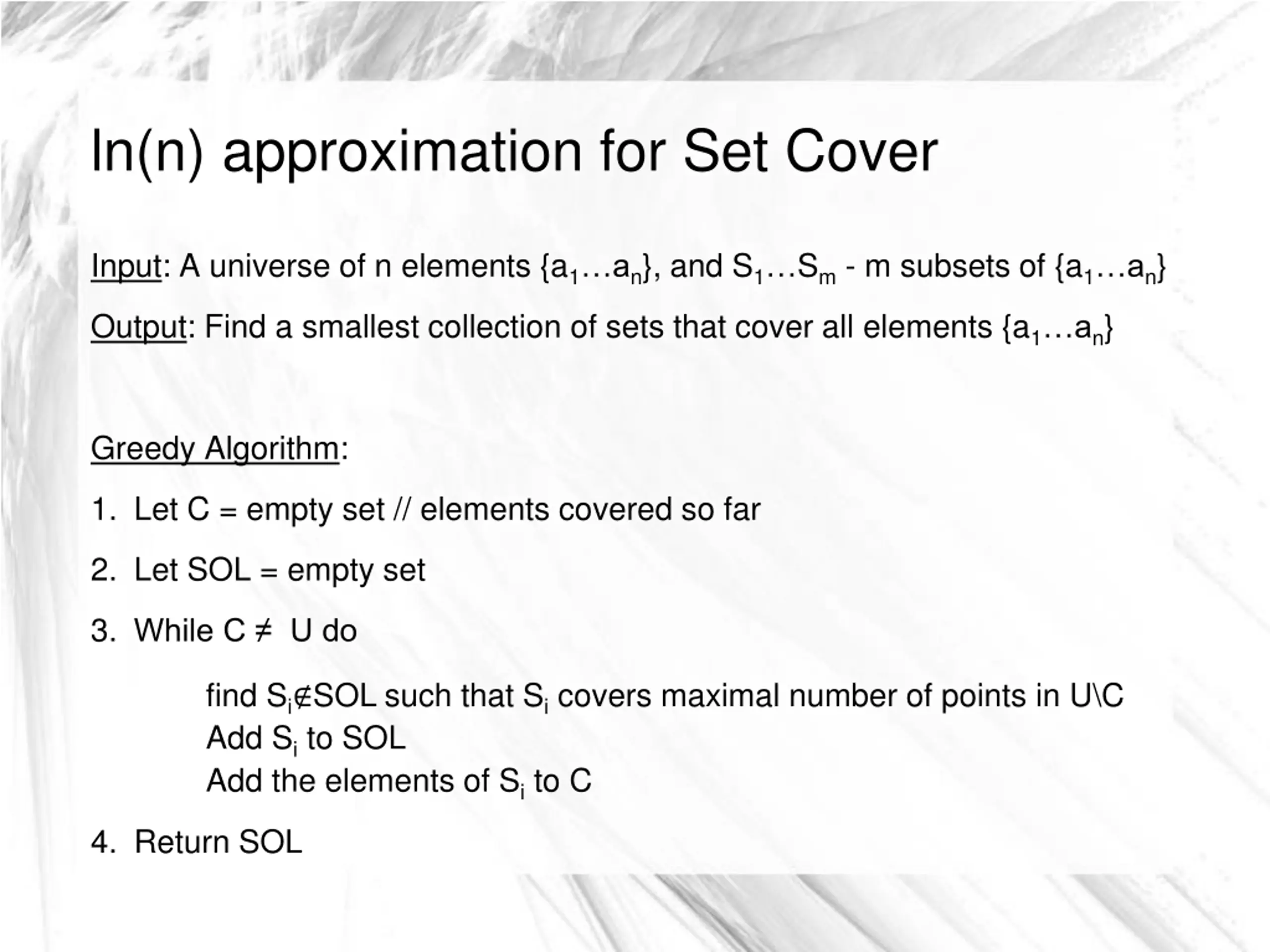 ln(n) approximation for Set Cover Input: A universe of n elements {a1 an}, and S1 Sm - m subsets of {a1 an} Output: Find a smallest collection of sets that cover all elements {a1 an} Greedy Algorithm: 1. Let C = empty set // elements covered so far 2. Let SOL = empty set 3. While C U do find Si SOL such that Si covers maximal number of points in U\C Add Si to SOL Add the elements of Si to C 4. Return SOL