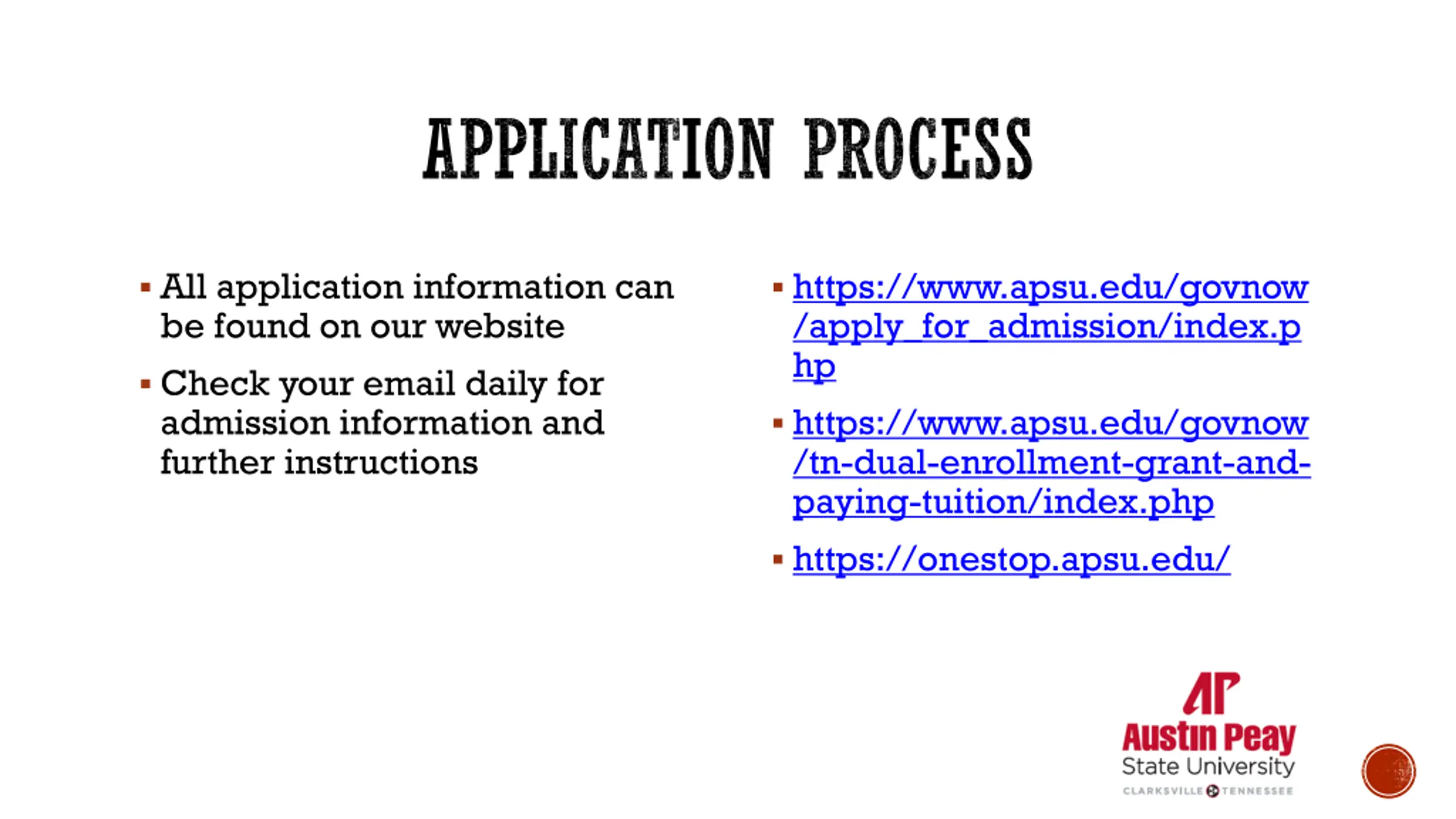 APPLICATION PROCESS All application information can be found on our website Check your email daily for admission information and further instructions https://www.apsu.edu/govnow /apply_for_admission/index.p hp https://www.apsu.edu/govnow /tn-dual-enrollment-grant-and- paying-tuition/index.php https://onestop.apsu.edu/