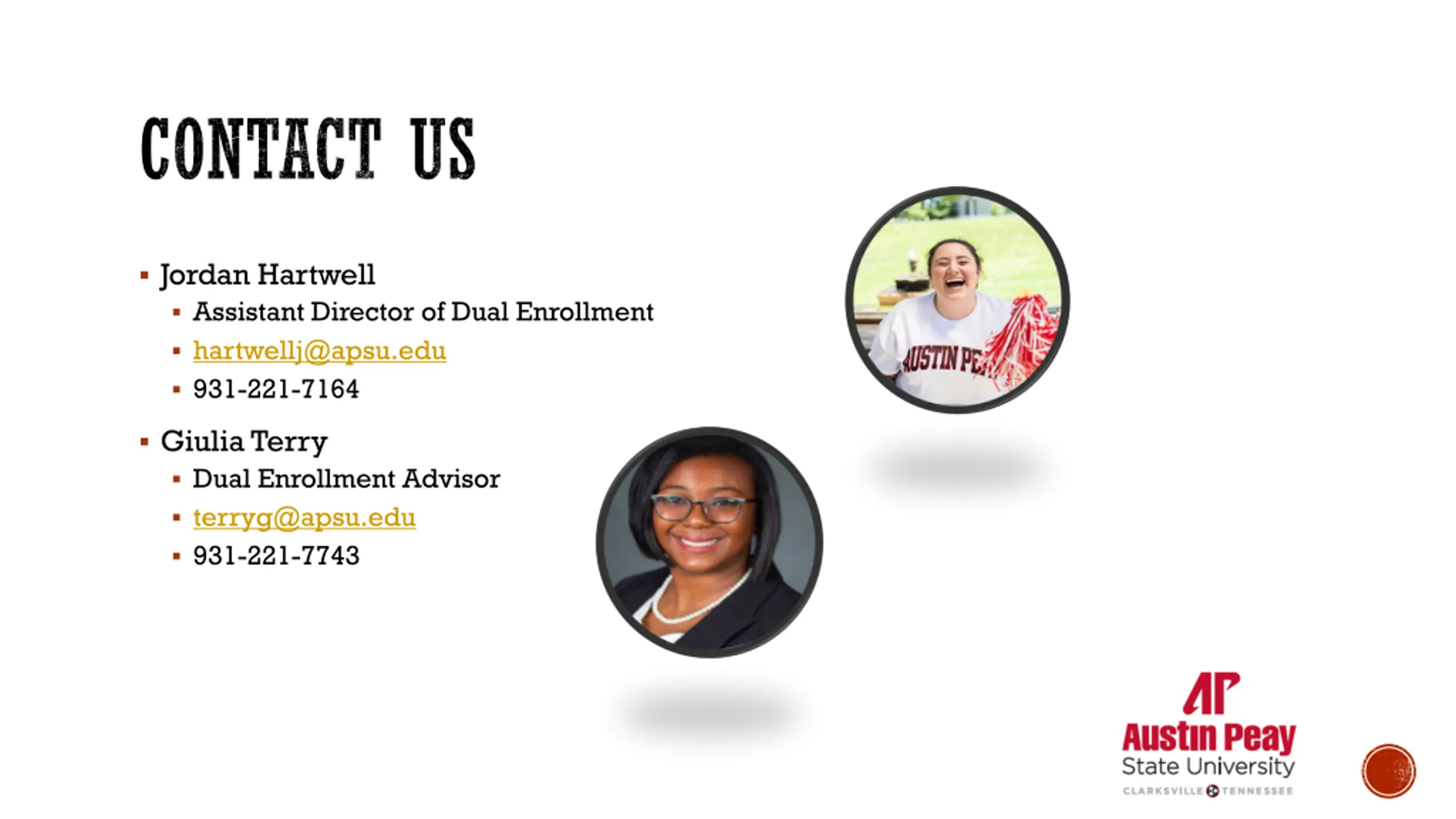 CONTACT US Jordan Hartwell Assistant Director of Dual Enrollment hartwellj@apsu.edu 931-221-7164 Giulia Terry Dual Enrollment Advisor terryg@apsu.edu 931-221-7743
