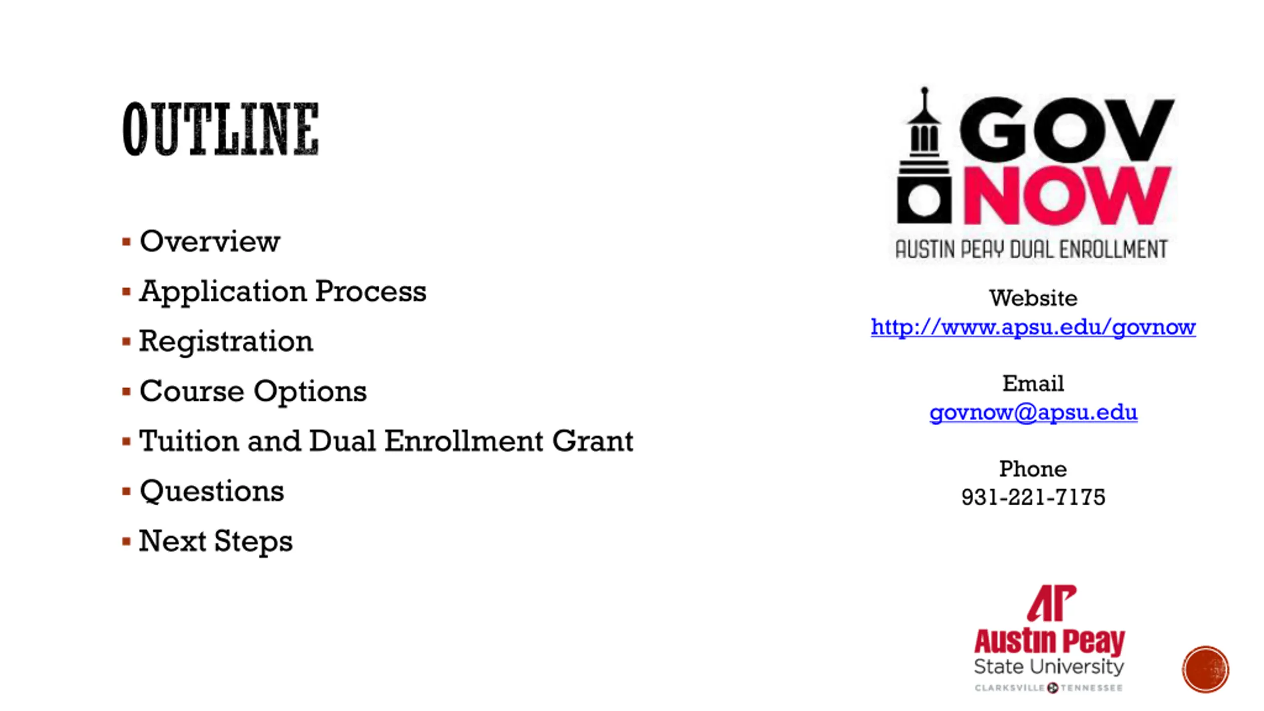 OUTLINE Overview Application Process Registration Course Options Tuition and Dual Enrollment Grant Questions Next Steps Website http://www.apsu.edu/govnow Email govnow@apsu.edu Phone 931-221-7175