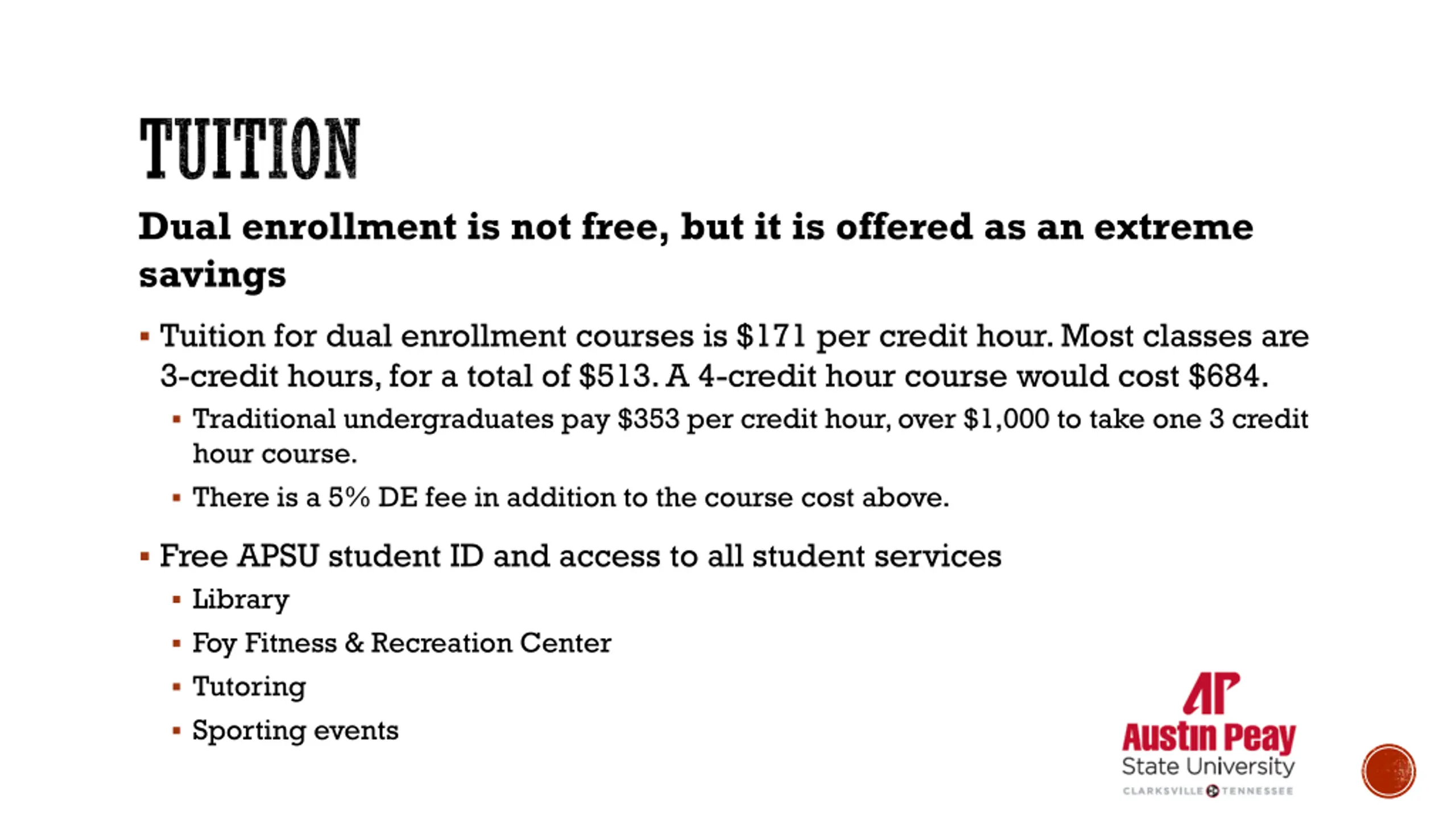 TUITION Dual enrollment is not free, but it is offered as an extreme savings Tuition for dual enrollment courses is $171 per credit hour. Most classes are 3-credit hours, for a total of $513. A 4-credit hour course would cost $684. Traditional undergraduates pay $353 per credit hour, over $1,000 to take one 3 credit hour course. There is a 5% DE fee in addition to the course cost above. Free APSU student ID and access to all student services Library Foy Fitness & Recreation Center Tutoring Sporting events