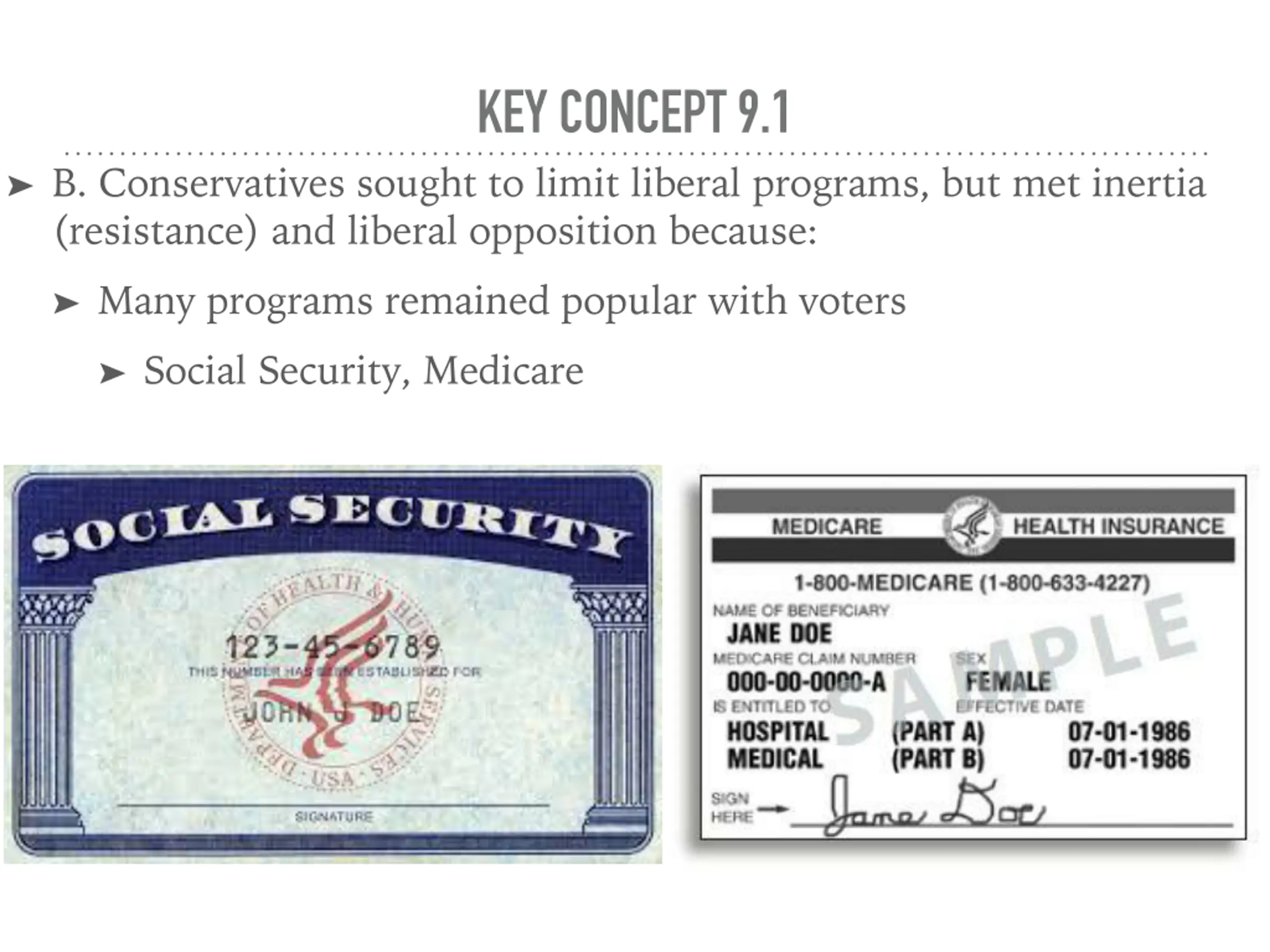 KEY CONCEPT 9.1 B. Conservatives sought to limit liberal programs, but met inertia (resistance) and liberal opposition because: Many programs remained popular with voters Social Security, Medicare