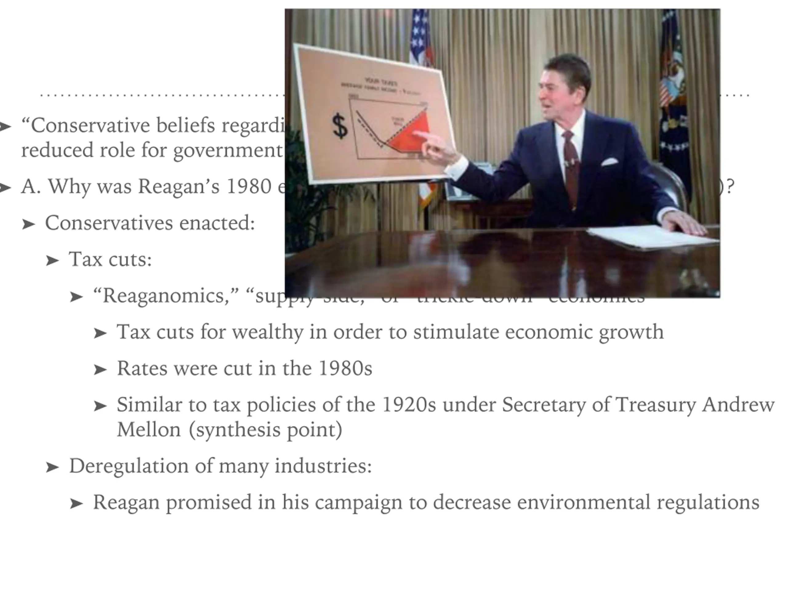 KEY CONCEPT 9.1, I Conservative beliefs regarding the need for traditional social values and a reduced role for government advanced in U.S. politics after 1980. A. Why was Reagan s 1980 election victory a milestone (watershed election)? Conservatives enacted: Tax cuts: Reaganomics, supply-side, or trickle-down economics Tax cuts for wealthy in order to stimulate economic growth Rates were cut in the 1980s Similar to tax policies of the 1920s under Secretary of Treasury Andrew Mellon (synthesis point) Deregulation of many industries: Reagan promised in his campaign to decrease environmental regulations