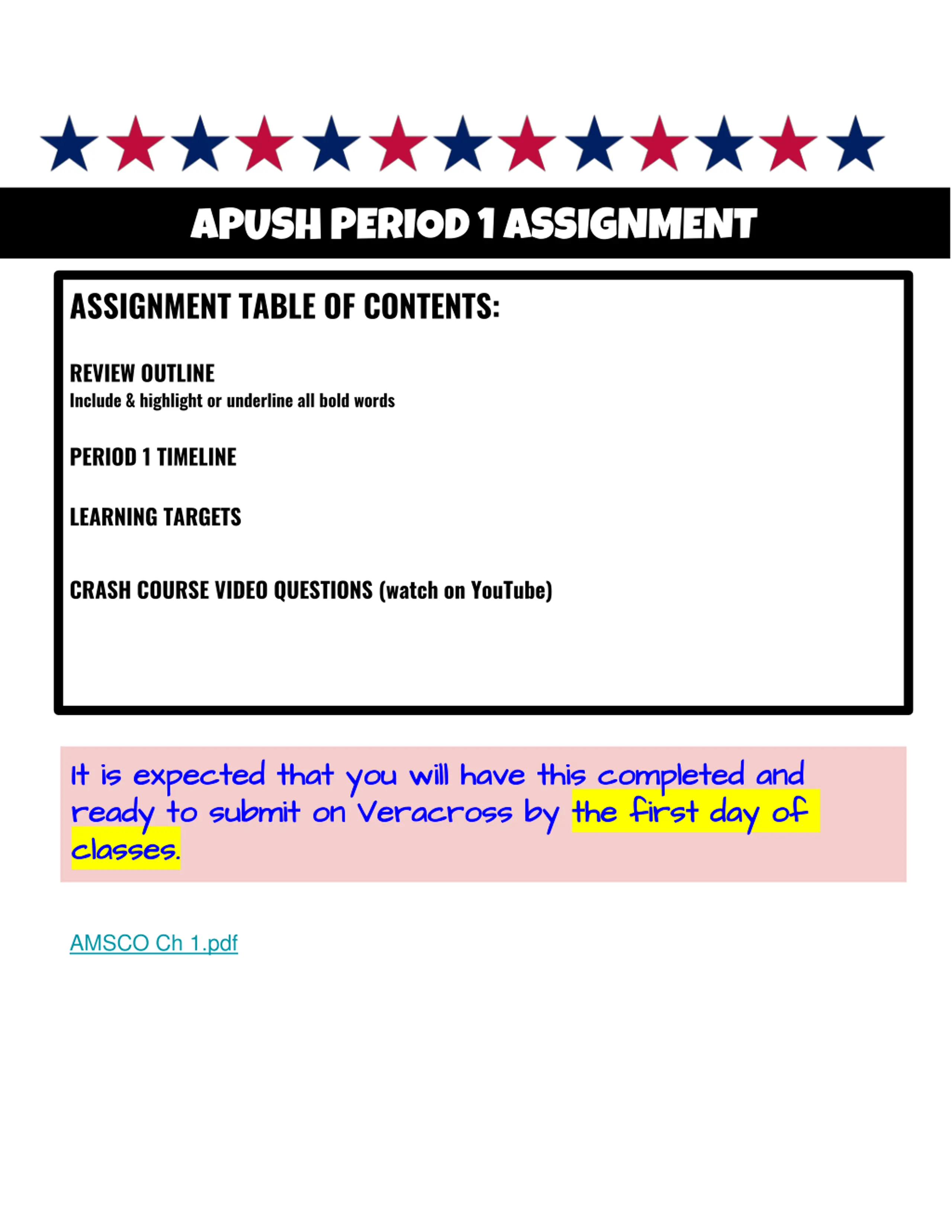 APUSH PERIOD 1 ASSIGNMENT ASSIGNMENT TABLE OF CONTENTS: REVIEW OUTLINE Include & highlight or underline all bold words PERIOD 1 TIMELINE LEARNING TARGETS CRASH COURSE VIDEO QUESTIONS (watch on YouTube) It is expected that you will have this completed and It is expected that you will have this completed and ready to submit on Veracross by ready to submit on Veracross by the first day of classes. classes. the first day of AMSCO Ch 1.pdf AMSCO Ch 1.pdf