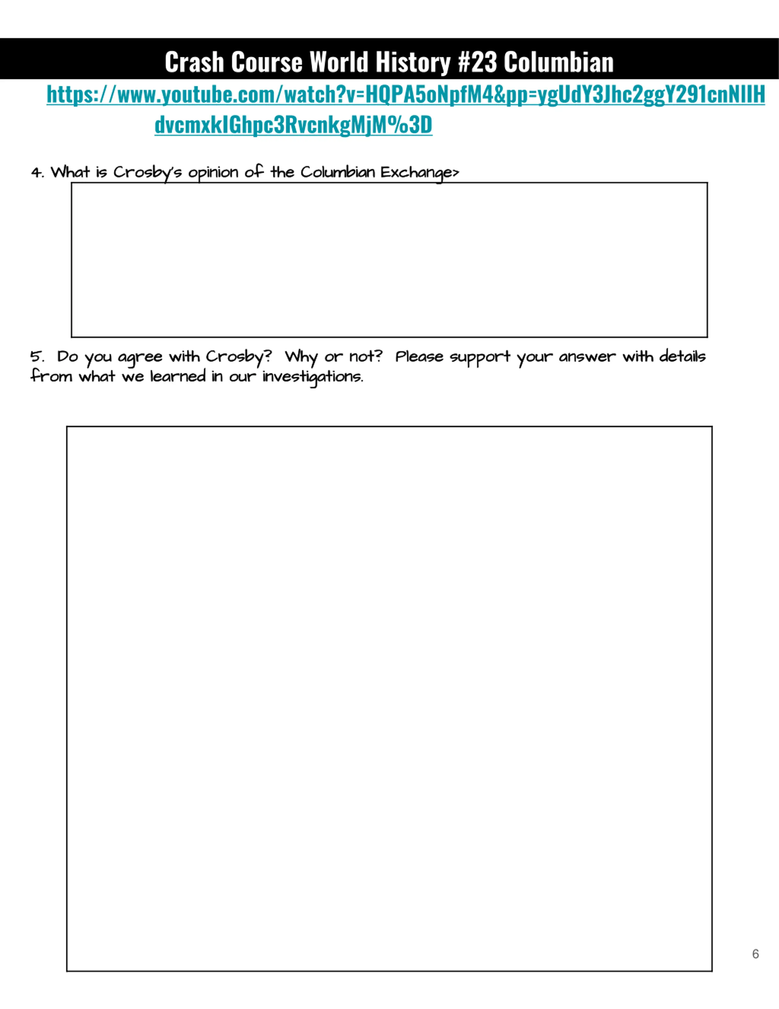 Crash Course World History #23 Columbian Exchttps://www.youtube.com/watch?v=HQPA5oNpfM4&pp=ygUdY3Jhc2ggY291cnNlIH dvcmxkIGhpc3RvcnkgMjM%3Dhange on YouTube. 4. What is Crosby s opinion of the Columbian Exchange> 4. What is Crosby s opinion of the Columbian Exchange> 5. Do you agree with Crosby? Why or not? Please support your answer with details 5. Do you agree with Crosby? Why or not? Please support your answer with details from what we learned in our investigations. from what we learned in our investigations. 6
