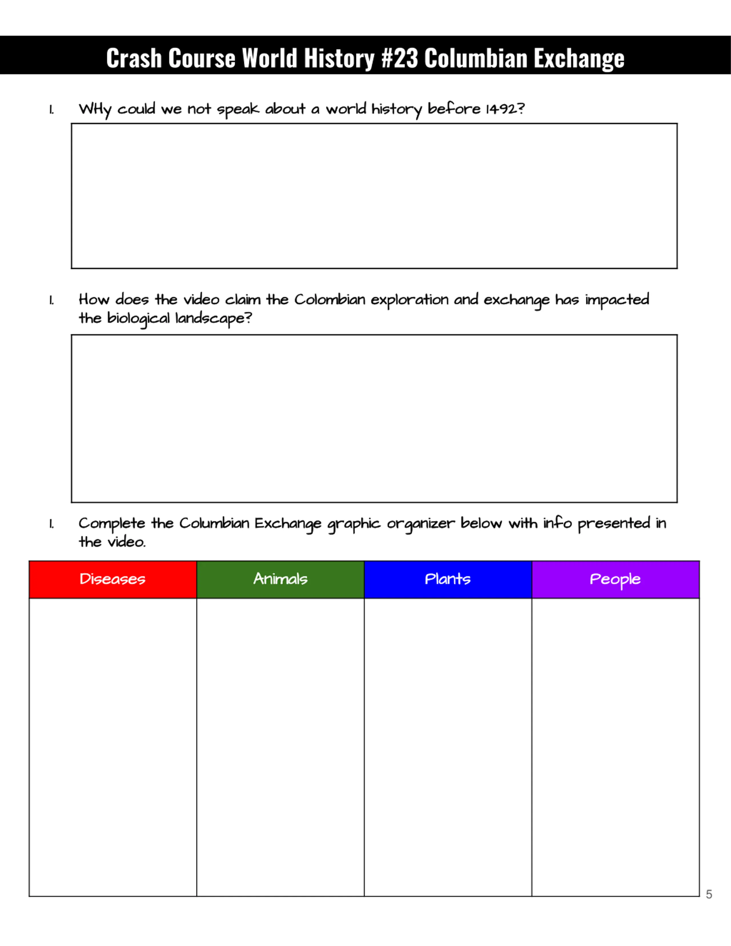 Crash Course World History #23 Columbian Exchange 1. 1. WHy could we not speak about a world history before 1492? WHy could we not speak about a world history before 1492? 1. 1. How does the video claim the Colombian exploration and exchange has impacted How does the video claim the Colombian exploration and exchange has impacted the biological landscape? the biological landscape? 1. 1. Complete the Columbian Exchange graphic organizer below with info presented in Complete the Columbian Exchange graphic organizer below with info presented in the video. the video. Diseases Diseases Animals Animals Plants Plants People People 5