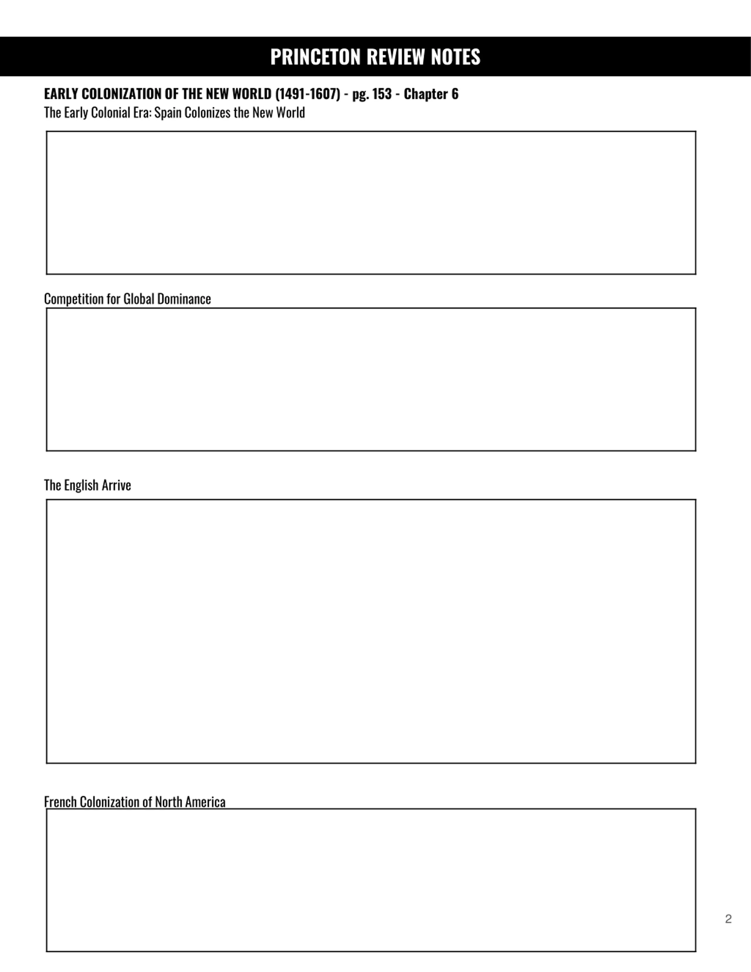 PRINCETON REVIEW NOTES EARLY COLONIZATION OF THE NEW WORLD (1491-1607) - pg. 153 - Chapter 6 The Early Colonial Era: Spain Colonizes the New World Competition for Global Dominance The English Arrive French Colonization of North America 2