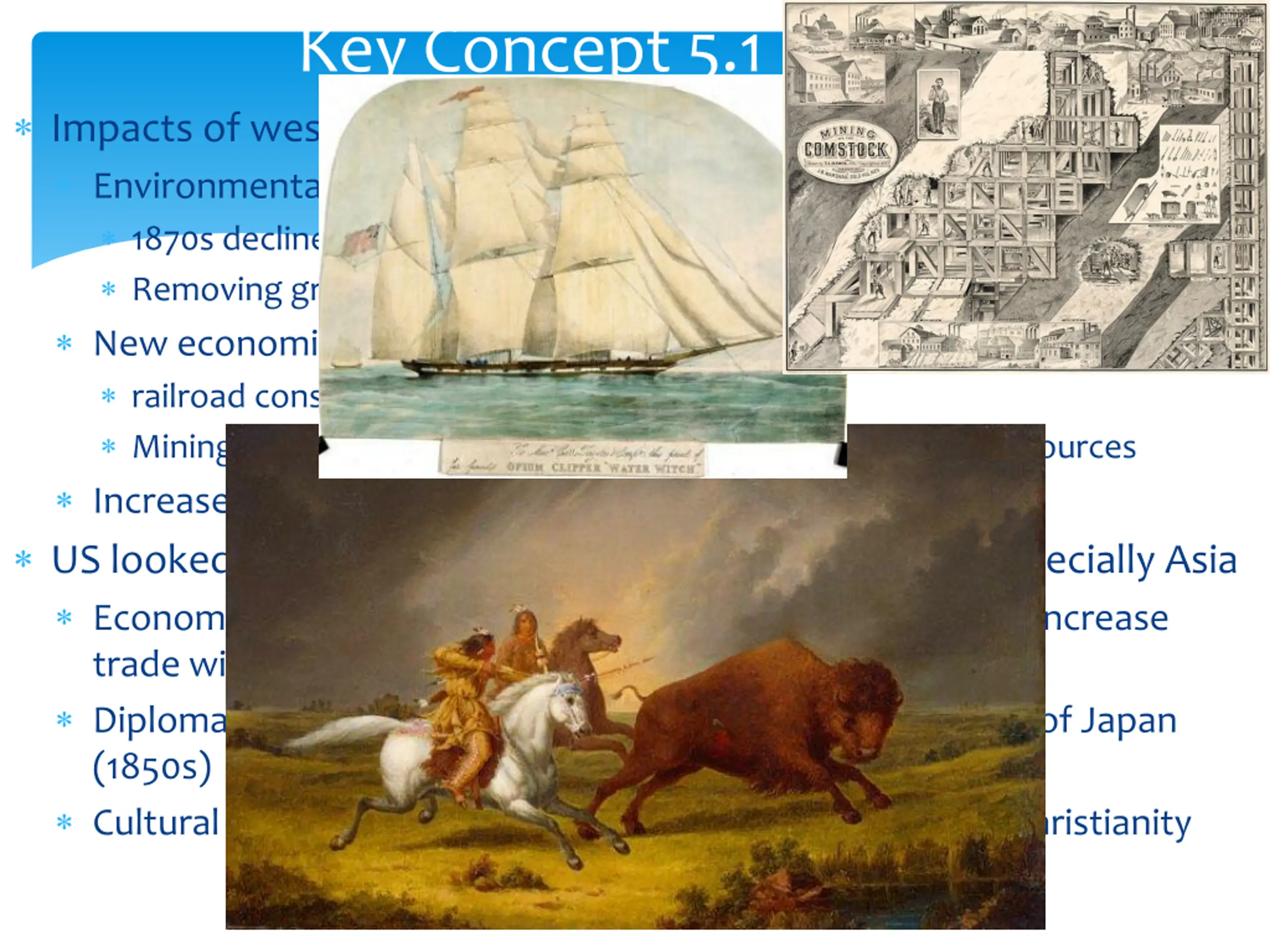 Key Concept 5.1 I Cont. Impacts of westward expansion? Environmental transformation: 1870s decline of Buffalo Removing grass to plant led to erosion of soil New economic activities: railroad construction, cities built around RRs Mining Comstock Lode silver settlements built around resources Increased settlement, especially on former Native land US looked to expand trade beyond its own borders, especially Asia Economic initiatives Clipper ships faster travel, helped increase trade with China (tea) Diplomatic initiatives Matthew Perry and the opening of Japan (1850s) Cultural initiatives Missionaries in China helped spread Christianity