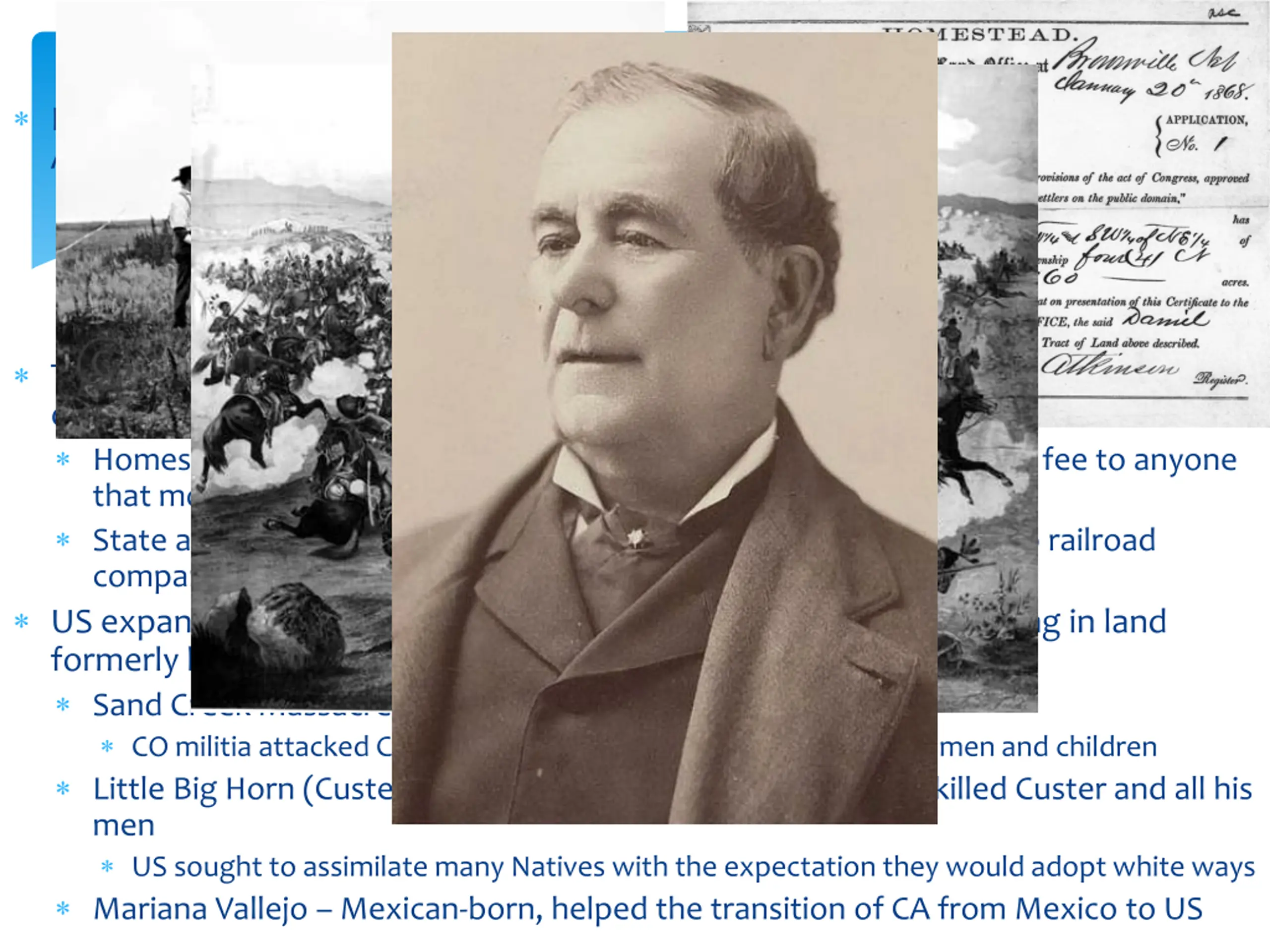 Key Concept 5.1 II New economic opportunities and religious refuge out west for Asians, African Americans, and whites Gold Rush (1840s) in California Cities grew in population overnight Mormons sought refuge in Utah Cattle ranching in the Dakotas The federal government (during and post-Civil War) helped promote economic development and westward expansion Homestead Act (1862): 160 acres of land would be given for a small fee to anyone that moved west State and federal governments often gave subsidies ($ and land) to railroad companies to build US expansion led to conflict with Natives and Hispanics (those living in land formerly belonging to Mexico), often changing their ways of life Sand Creek Massacre (November 29, 1864): CO militia attacked Cheyenne Indians, killed over 100, mostly women and children Little Big Horn (Custer s Last Stand) Natives attacked and killed Custer and all his men US sought to assimilate many Natives with the expectation they would adopt white ways Mariana Vallejo Mexican-born, helped the transition of CA from Mexico to US