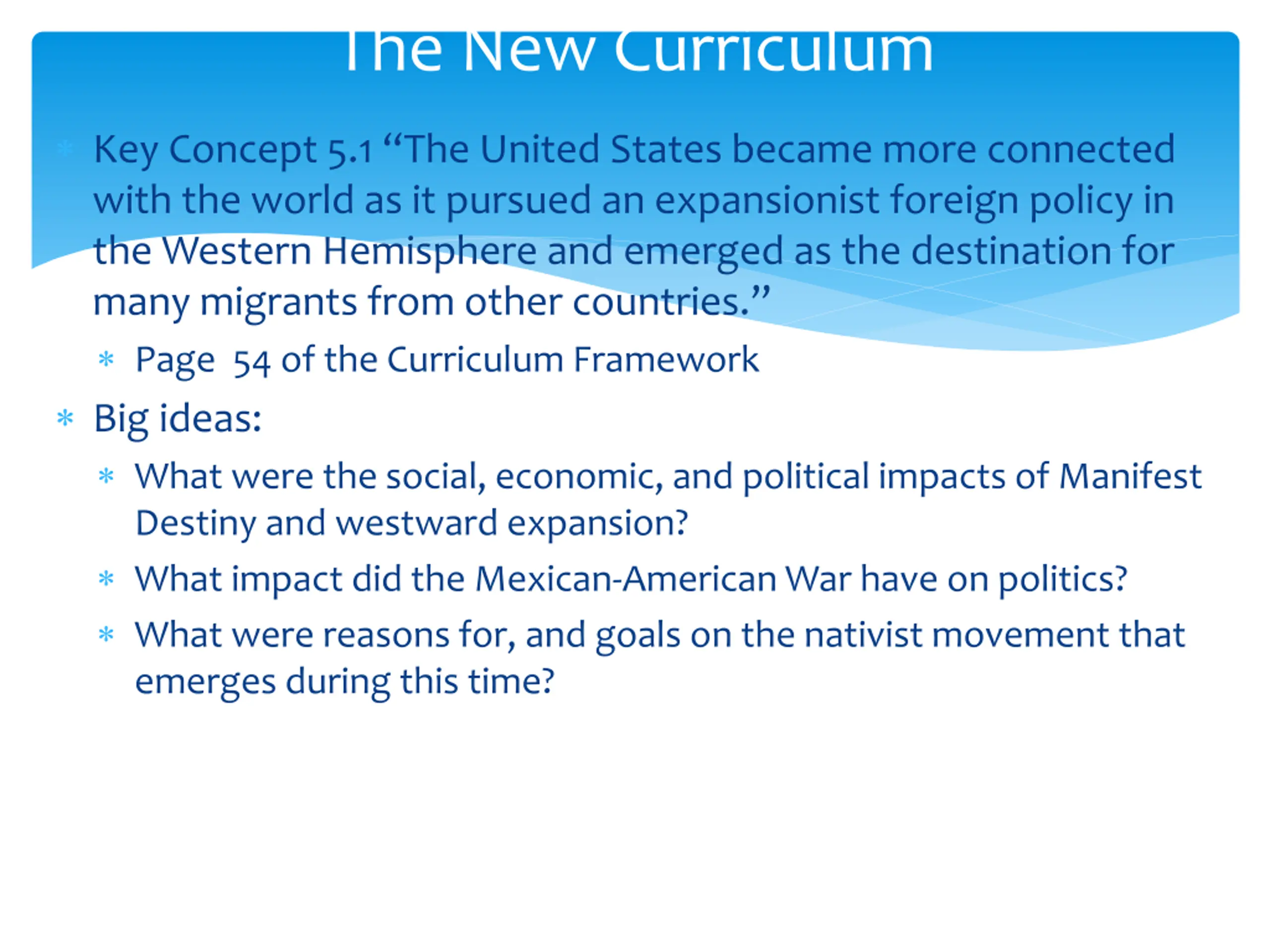 The New Curriculum Key Concept 5.1 The United States became more connected with the world as it pursued an expansionist foreign policy in the Western Hemisphere and emerged as the destination for many migrants from other countries. Page 54 of the Curriculum Framework Big ideas: What were the social, economic, and political impacts of Manifest Destiny and westward expansion? What impact did the Mexican-American War have on politics? What were reasons for, and goals on the nativist movement that emerges during this time?