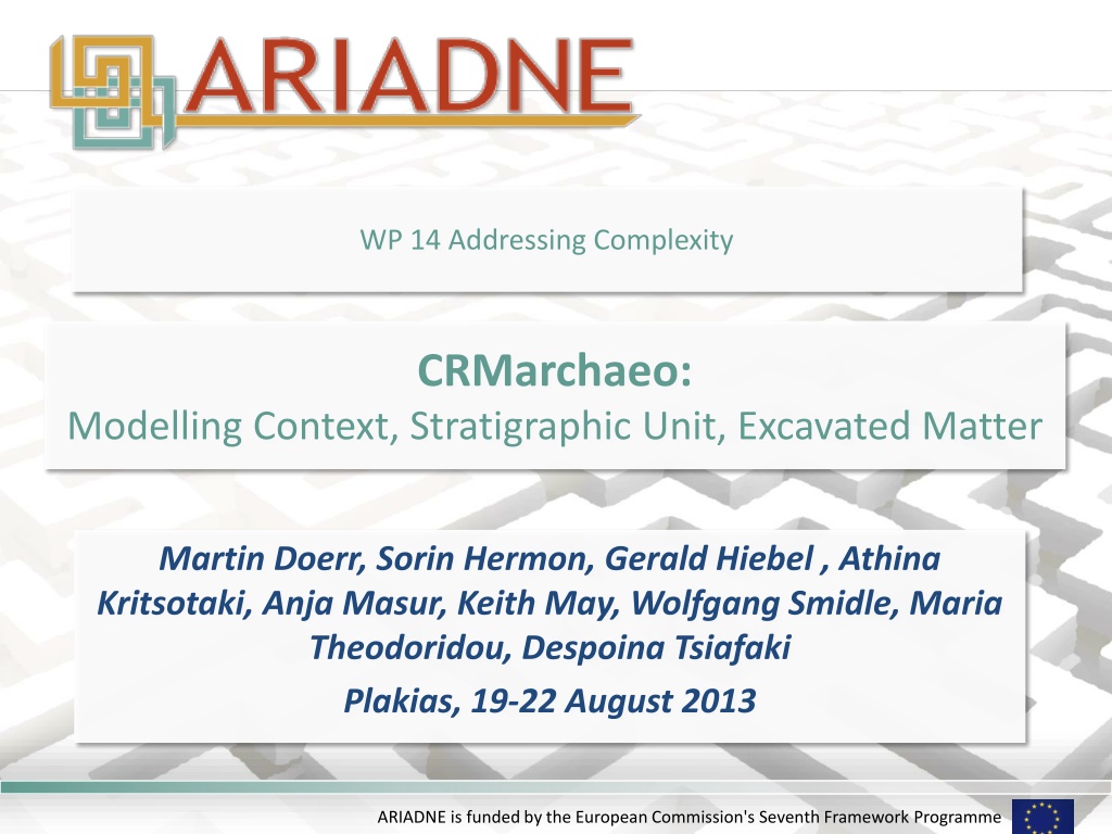 WP 14 Addressing Complexity CRMarchaeo: Modelling Context, Stratigraphic Unit, Excavated Matter Martin Doerr, Sorin Hermon, Gerald Hiebel , Athina Kritsotaki, Anja Masur, Keith May, Wolfgang Smidle, Maria Theodoridou, Despoina Tsiafaki Plakias, 19-22 August 2013 ARIADNE is funded by the European Commission's Seventh Framework Programme