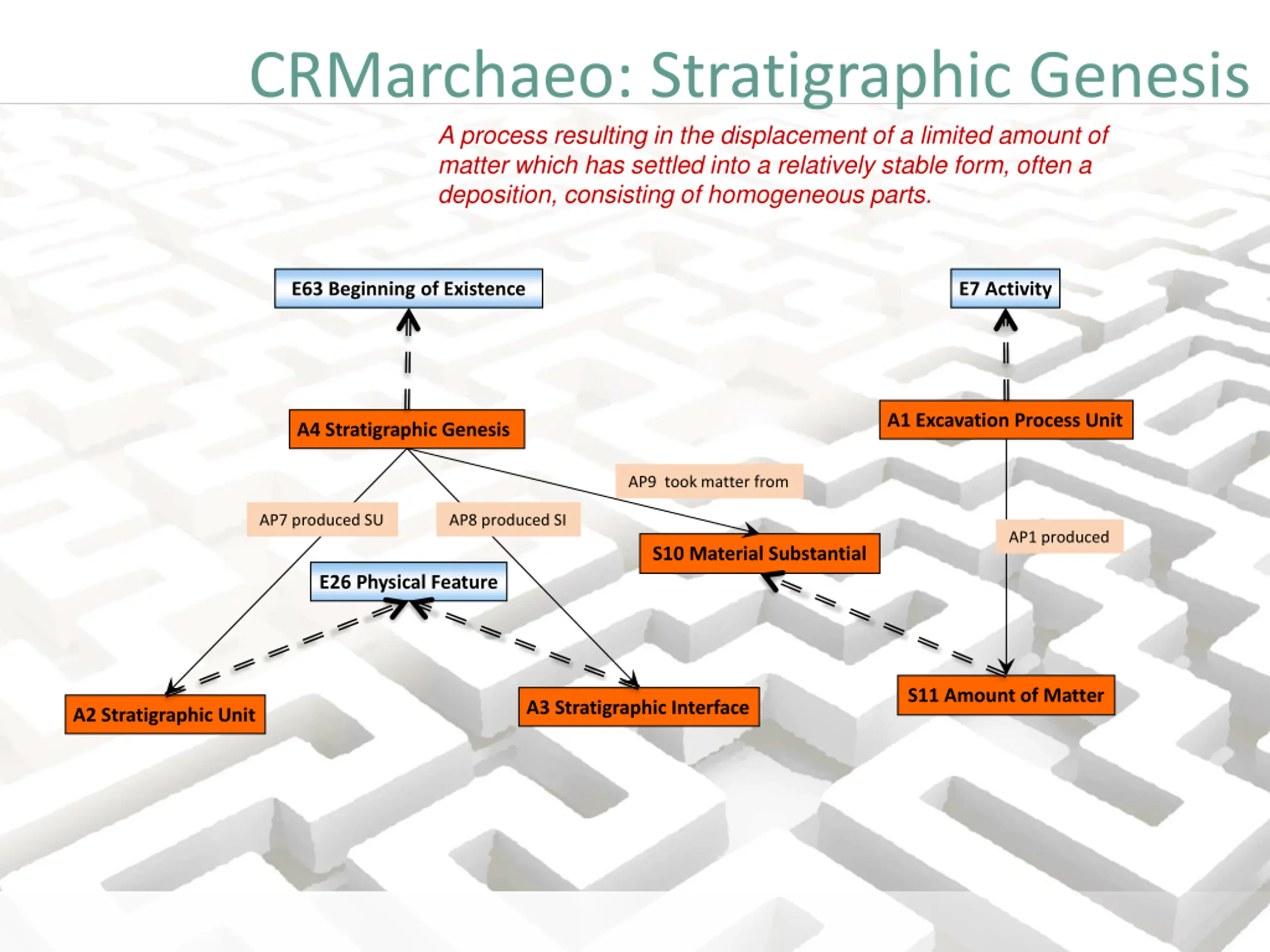 CRMarchaeo: Stratigraphic Genesis A process resulting in the displacement of a limited amount of matter which has settled into a relatively stable form, often a deposition, consisting of homogeneous parts. E63 Beginning of Existence E7 Activity A1 Excavation Process Unit A4 Stratigraphic Genesis AP9 took matter from AP7 produced SU AP8 produced SI AP1 produced S10 Material Substantial E26 Physical Feature S11 Amount of Matter A3 Stratigraphic Interface A2 Stratigraphic Unit