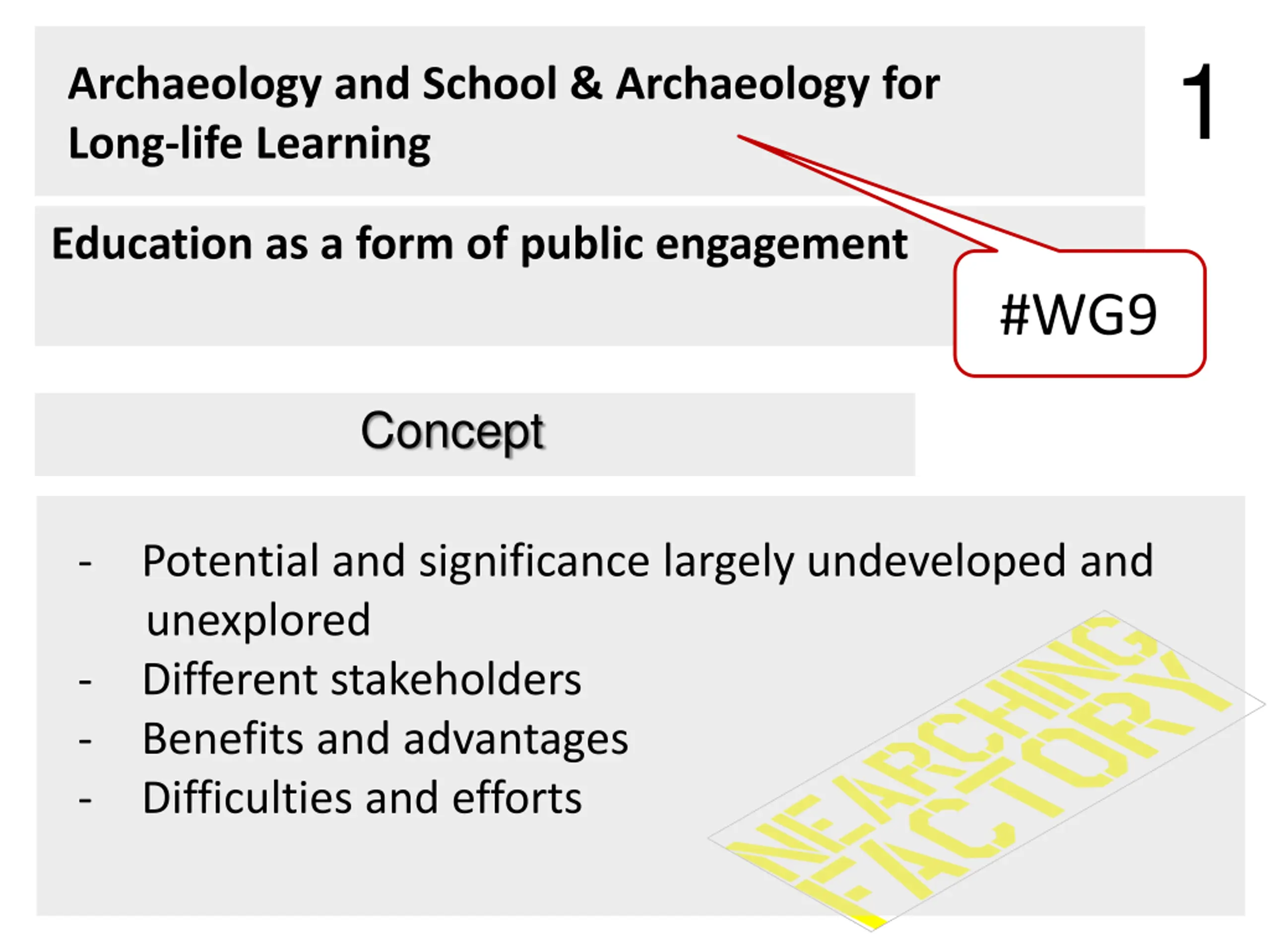 1 Archaeology and School & Archaeology for Long-life Learning Education as a form of public engagement #WG9 Concept - Potential and significance largely undeveloped and unexplored Different stakeholders Benefits and advantages Difficulties and efforts - - -