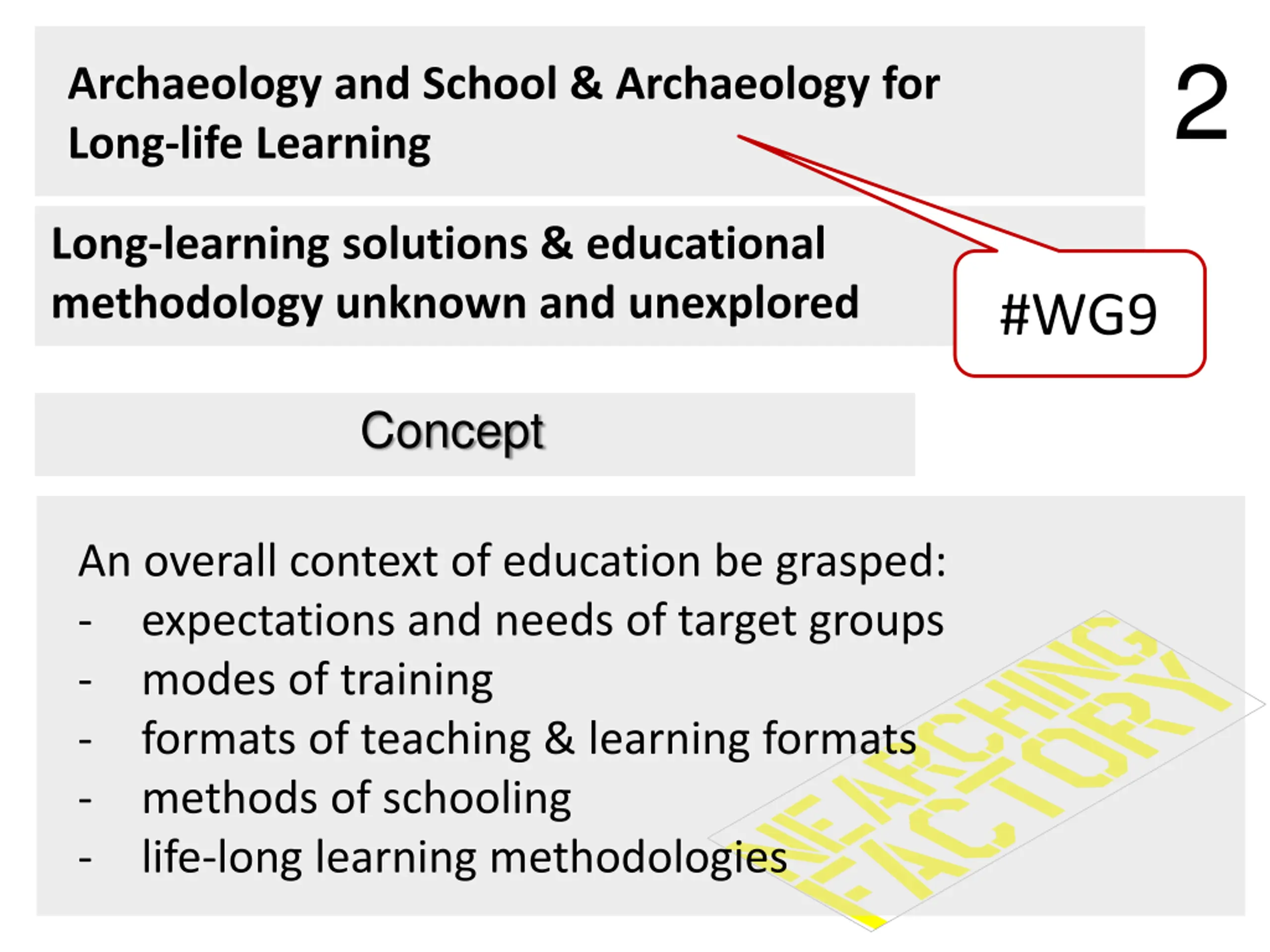 2 Archaeology and School & Archaeology for Long-life Learning Long-learning solutions & educational methodology unknown and unexplored #WG9 Concept An overall context of education be grasped: - expectations and needs of target groups - modes of training - formats of teaching & learning formats - methods of schooling - life-long learning methodologies