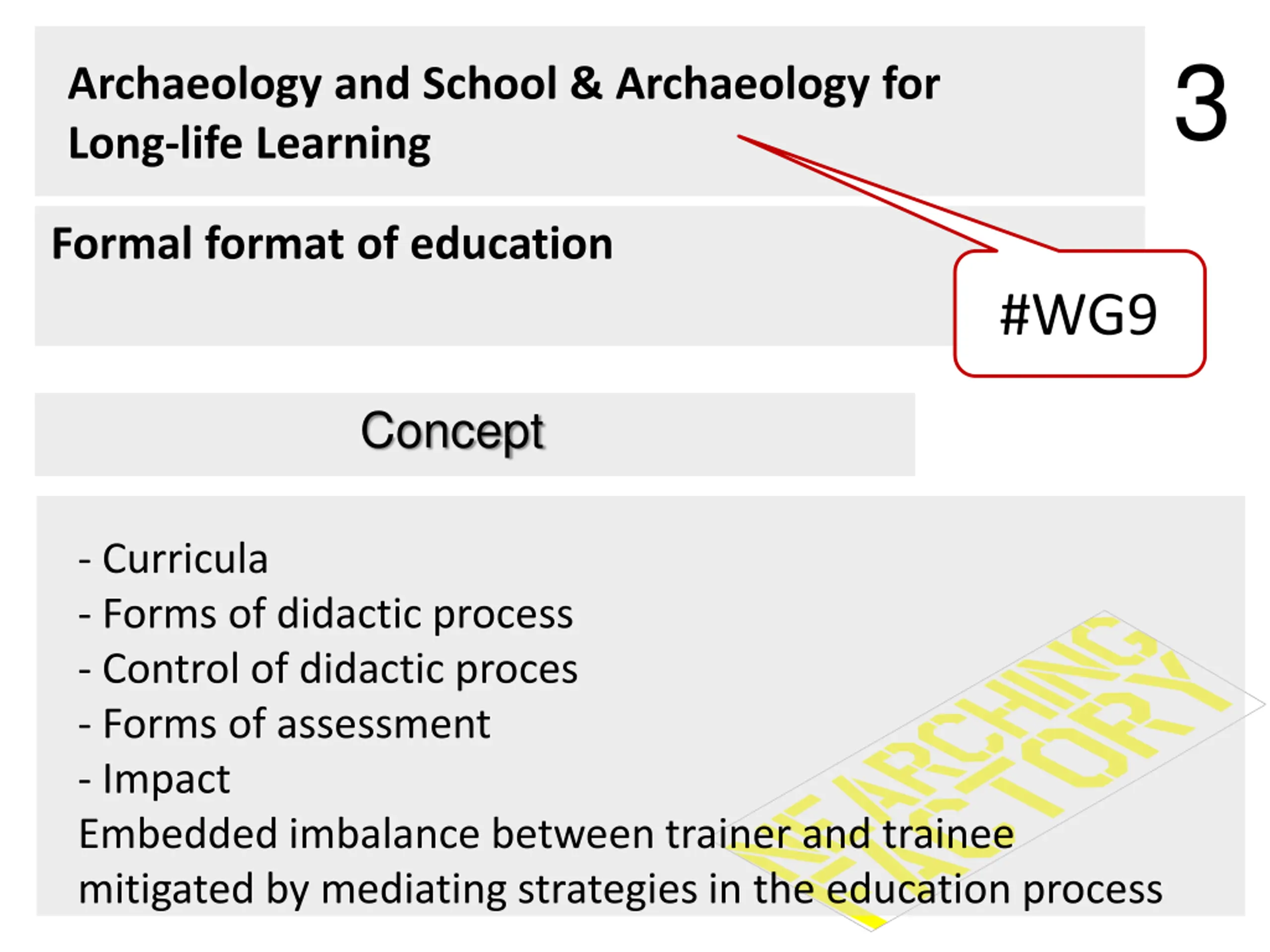 3 Archaeology and School & Archaeology for Long-life Learning Formal format of education #WG9 Concept - Curricula - Forms of didactic process - Control of didactic proces - Forms of assessment - Impact Embedded imbalance between trainer and trainee mitigated by mediating strategies in the education process