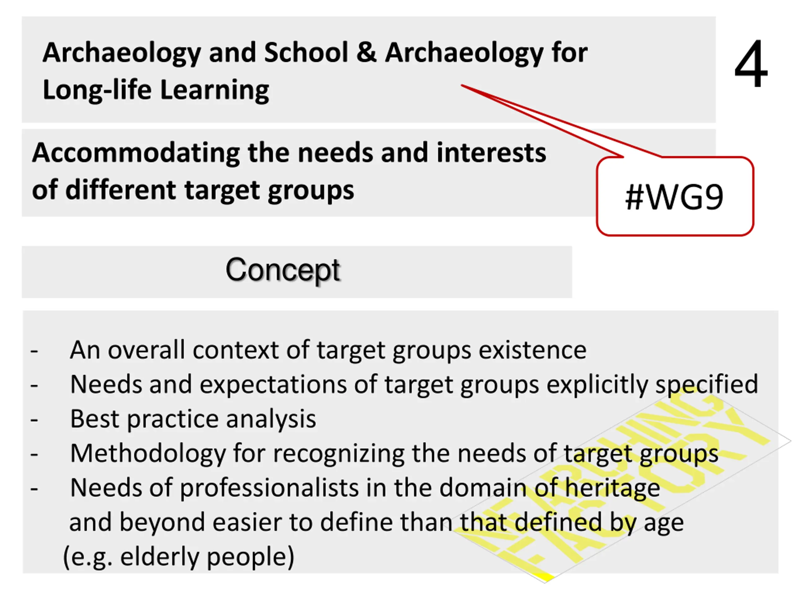 4 Archaeology and School & Archaeology for Long-life Learning Accommodating the needs and interests of different target groups #WG9 Concept - - - - - An overall context of target groups existence Needs and expectations of target groups explicitly specified Best practice analysis Methodology for recognizing the needs of target groups Needs of professionalists in the domain of heritage and beyond easier to define than that defined by age (e.g. elderly people)