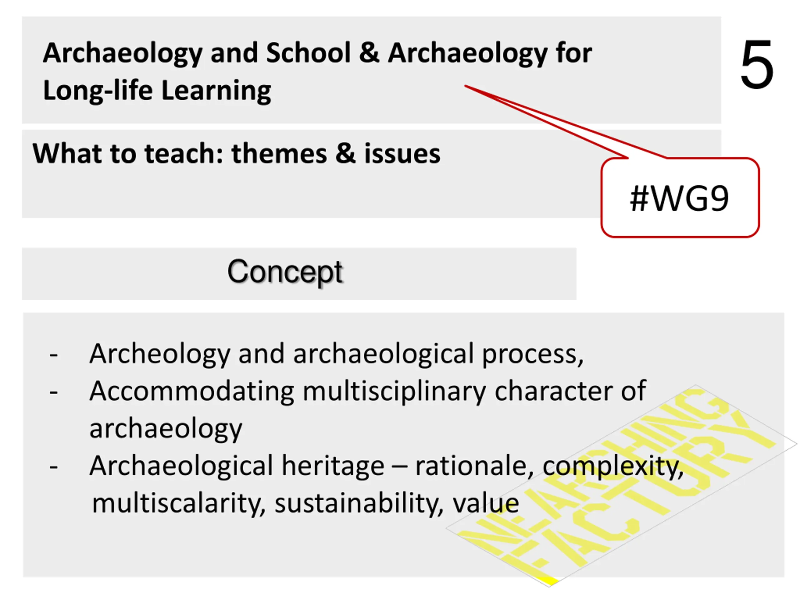 5 Archaeology and School & Archaeology for Long-life Learning What to teach: themes & issues #WG9 Concept - - Archeology and archaeological process, Accommodating multisciplinary character of archaeology Archaeological heritage rationale, complexity, multiscalarity, sustainability, value -