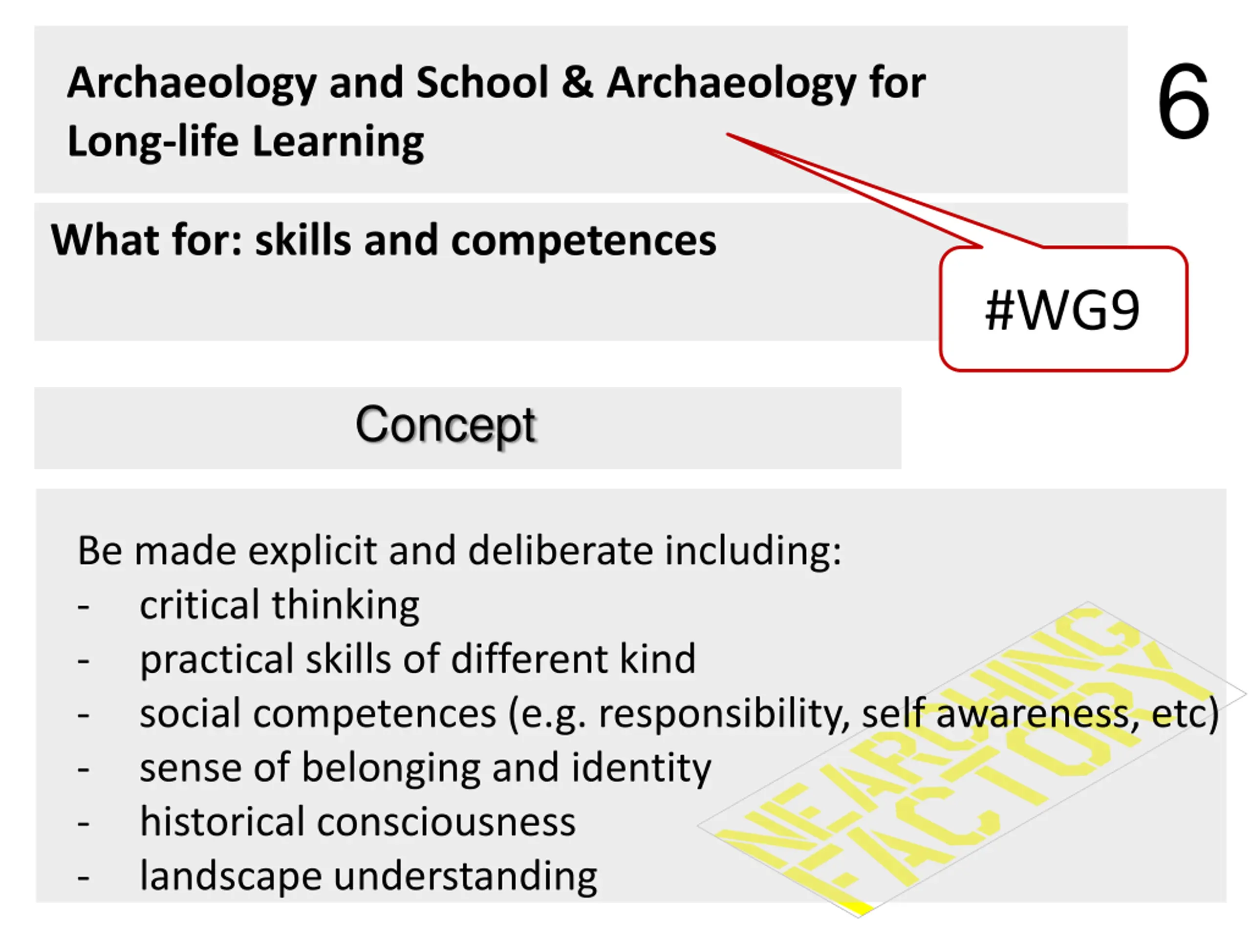 6 Archaeology and School & Archaeology for Long-life Learning What for: skills and competences #WG9 Concept Be made explicit and deliberate including: - critical thinking - practical skills of different kind - social competences (e.g. responsibility, self awareness, etc) - sense of belonging and identity - historical consciousness - landscape understanding