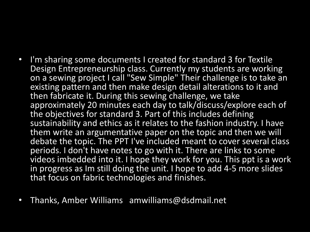 I'm sharing some documents I created for standard 3 for Textile Design Entrepreneurship class. Currently my students are working on a sewing project I call "Sew Simple" Their challenge is to take an existing pattern and then make design detail alterations to it and then fabricate it. During this sewing challenge, we take approximately 20 minutes each day to talk/discuss/explore each of the objectives for standard 3. Part of this includes defining sustainability and ethics as it relates to the fashion industry. I have them write an argumentative paper on the topic and then we will debate the topic. The PPT I've included meant to cover several class periods. I don't have notes to go with it. There are links to some videos imbedded into it. I hope they work for you. This ppt is a work in progress as Im still doing the unit. I hope to add 4-5 more slides that focus on fabric technologies and finishes. Thanks, Amber Williams amwilliams@dsdmail.net