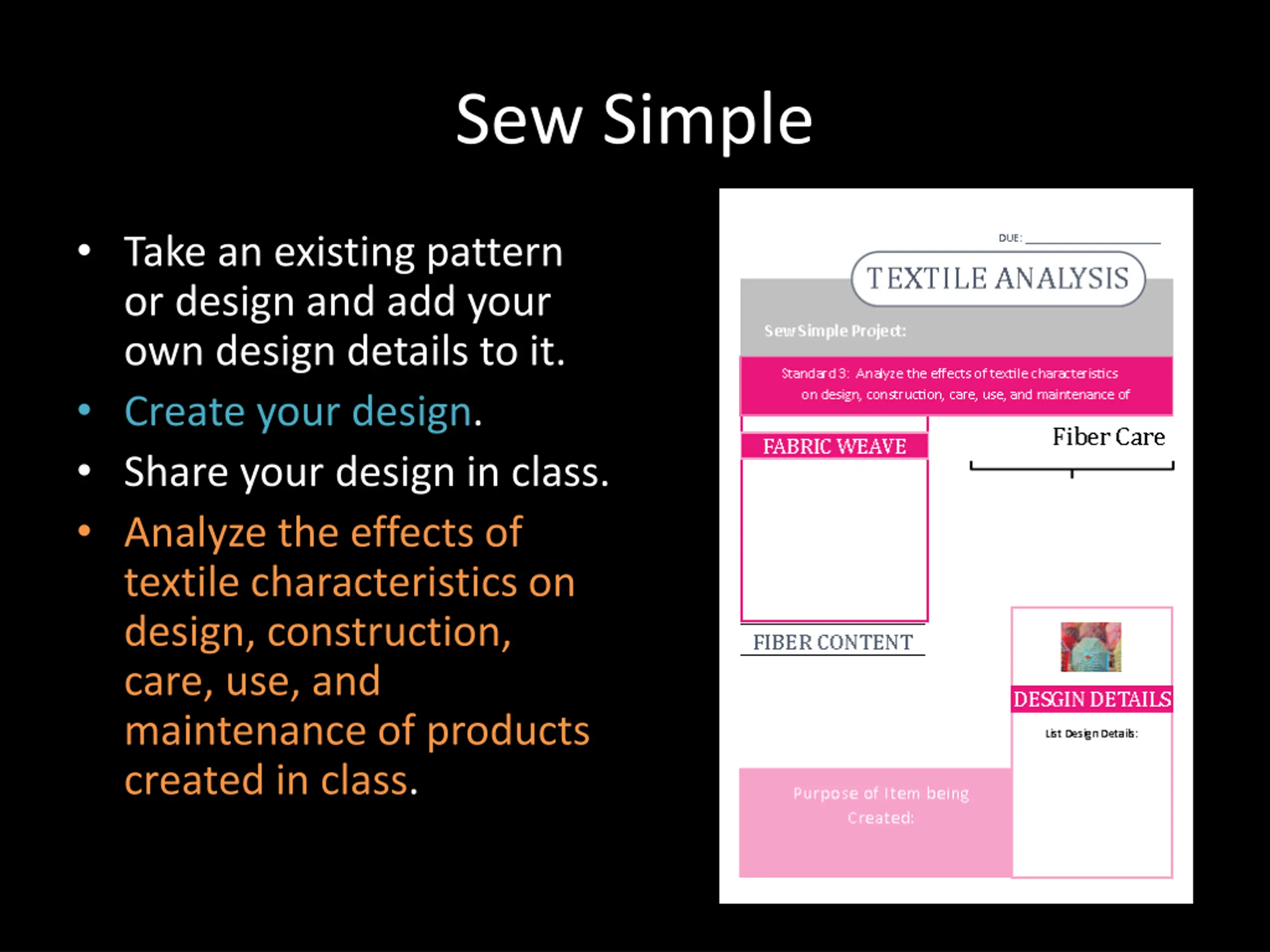 Sew Simple Take an existing pattern or design and add your own design details to it. Create your design. Share your design in class. Analyze the effects of textile characteristics on design, construction, care, use, and maintenance of products created in class.