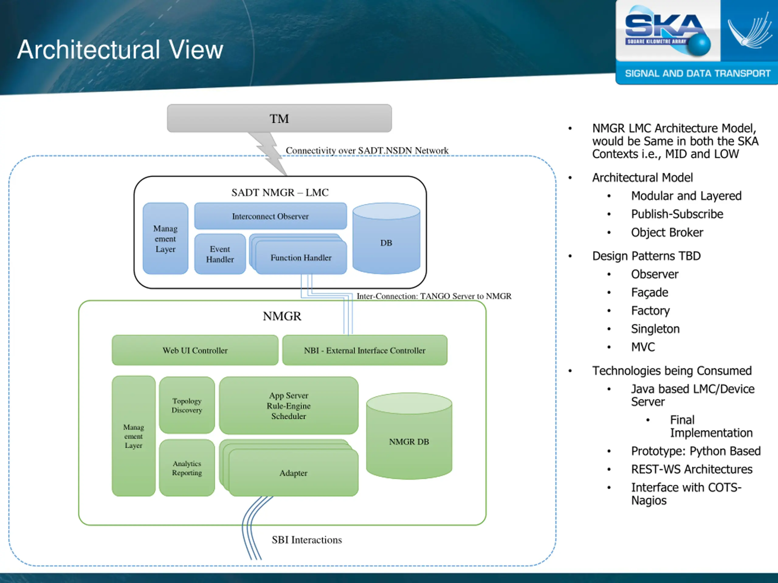 Architectural View TM NMGR LMC Architecture Model, would be Same in both the SKA Contexts i.e., MID and LOW Connectivity over SADT.NSDN Network Architectural Model Modular and Layered Publish-Subscribe Object Broker SADT NMGR LMC Interconnect Observer Manag ement Layer DB Event Handler Function Handler Function Handler Function Handler Design Patterns TBD Observer Fa ade Factory Singleton MVC Inter-Connection: TANGO Server to NMGR NMGR Web UI Controller NBI - External Interface Controller Technologies being Consumed Java based LMC/Device Server Final Implementation Prototype: Python Based REST-WS Architectures Interface with COTS- Nagios App Server Rule-Engine Scheduler Topology Discovery Manag ement Layer NMGR DB Function Handler Function Handler Adapter Analytics Reporting SBI Interactions