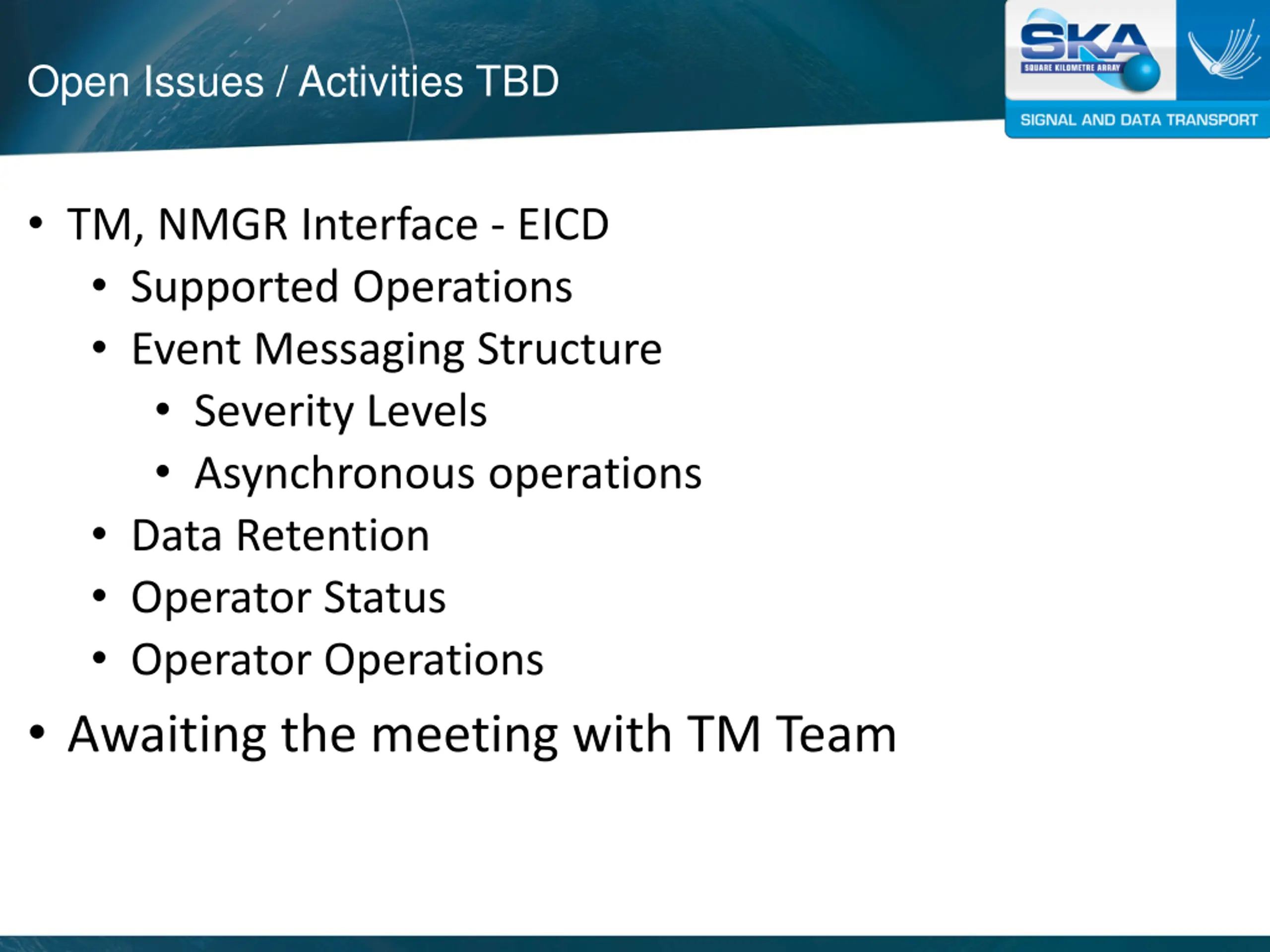 Open Issues / Activities TBD TM, NMGR Interface - EICD Supported Operations Event Messaging Structure Severity Levels Asynchronous operations Data Retention Operator Status Operator Operations Awaiting the meeting with TM Team