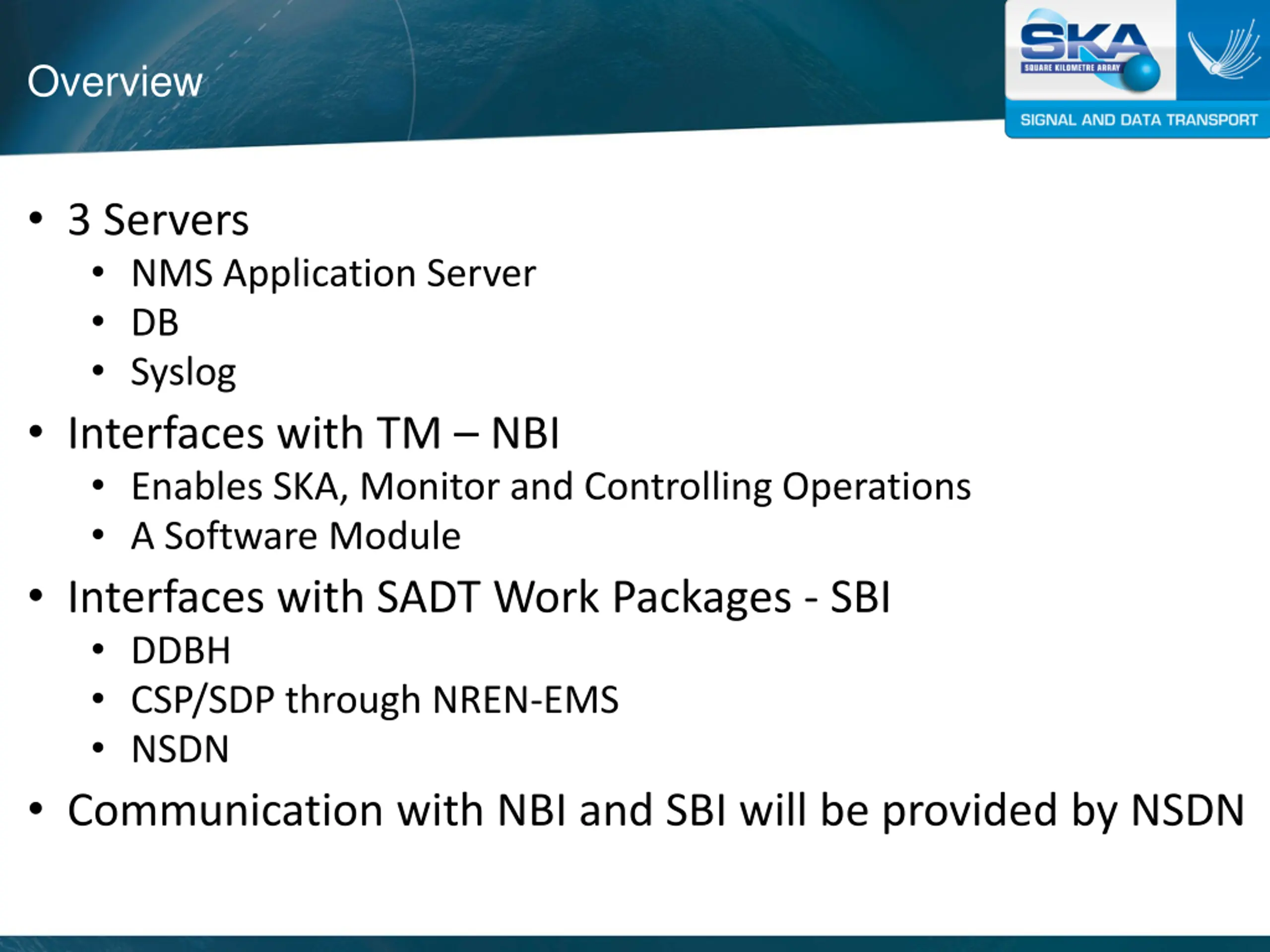 Overview 3 Servers NMS Application Server DB Syslog Interfaces with TM NBI Enables SKA, Monitor and Controlling Operations A Software Module Interfaces with SADT Work Packages - SBI DDBH CSP/SDP through NREN-EMS NSDN Communication with NBI and SBI will be provided by NSDN
