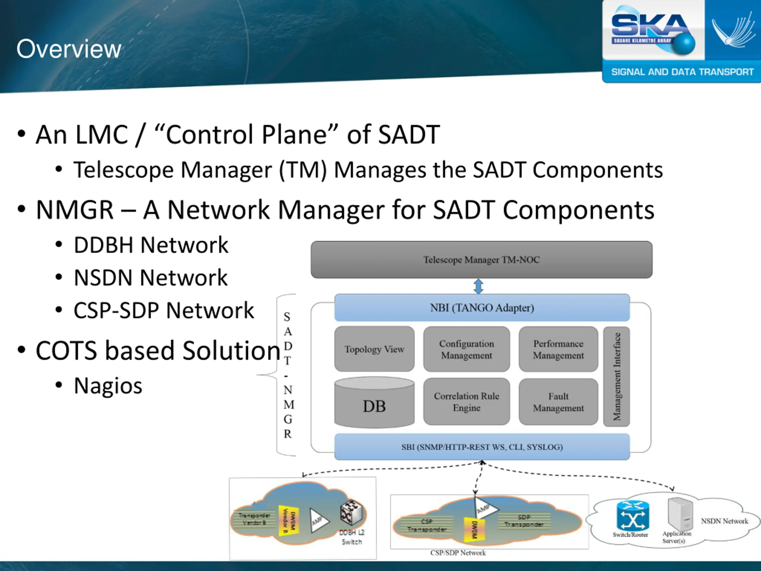 Overview An LMC / Control Plane of SADT Telescope Manager (TM) Manages the SADT Components NMGR A Network Manager for SADT Components DDBH Network NSDN Network CSP-SDP Network COTS based Solution Nagios