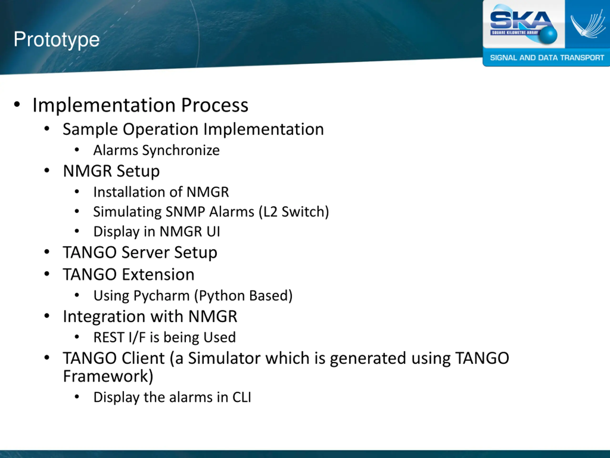 Prototype Implementation Process Sample Operation Implementation Alarms Synchronize NMGR Setup Installation of NMGR Simulating SNMP Alarms (L2 Switch) Display in NMGR UI TANGO Server Setup TANGO Extension Using Pycharm (Python Based) Integration with NMGR REST I/F is being Used TANGO Client (a Simulator which is generated using TANGO Framework) Display the alarms in CLI