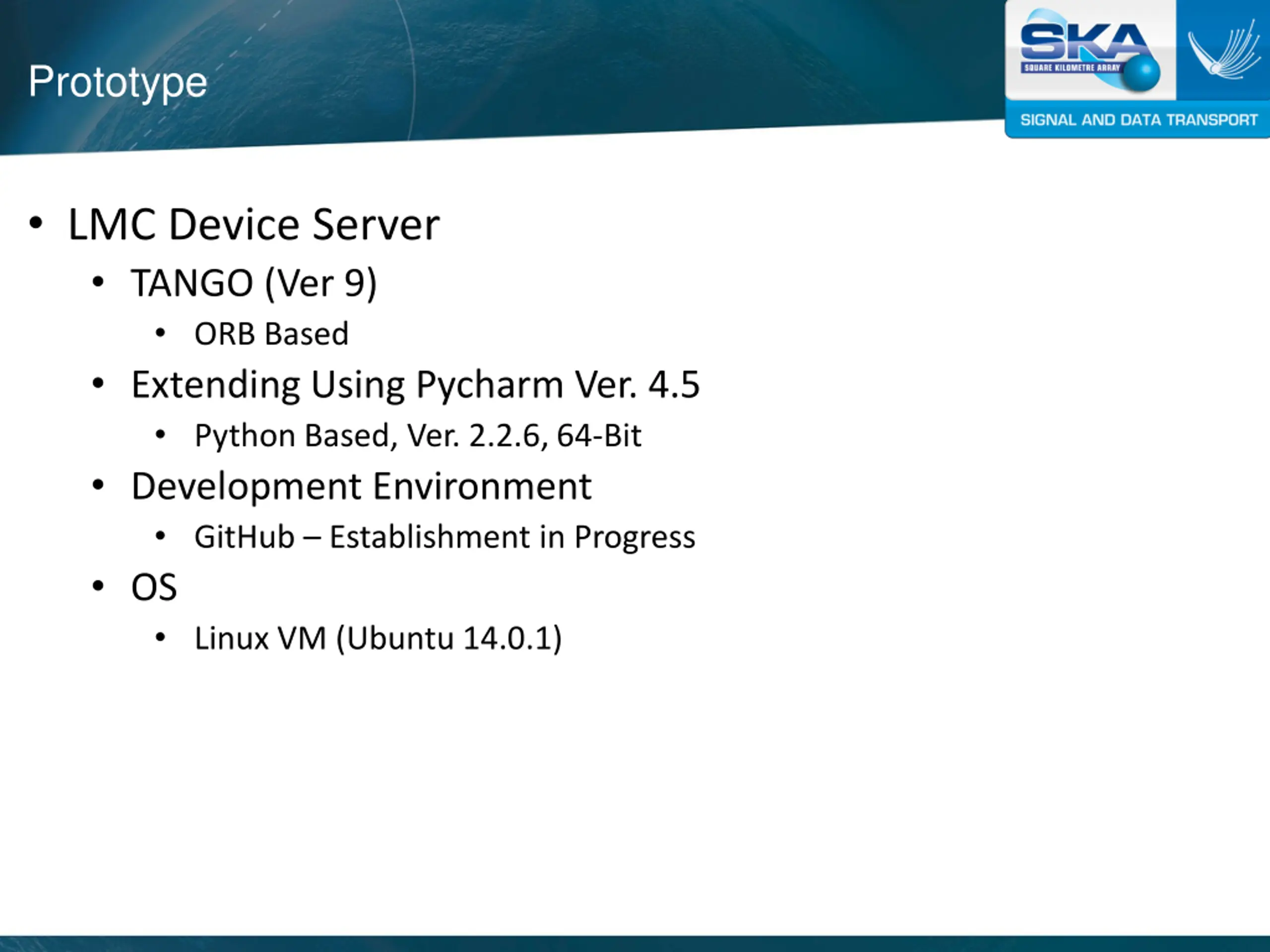 Prototype LMC Device Server TANGO (Ver 9) ORB Based Extending Using Pycharm Ver. 4.5 Python Based, Ver. 2.2.6, 64-Bit Development Environment GitHub Establishment in Progress OS Linux VM (Ubuntu 14.0.1)