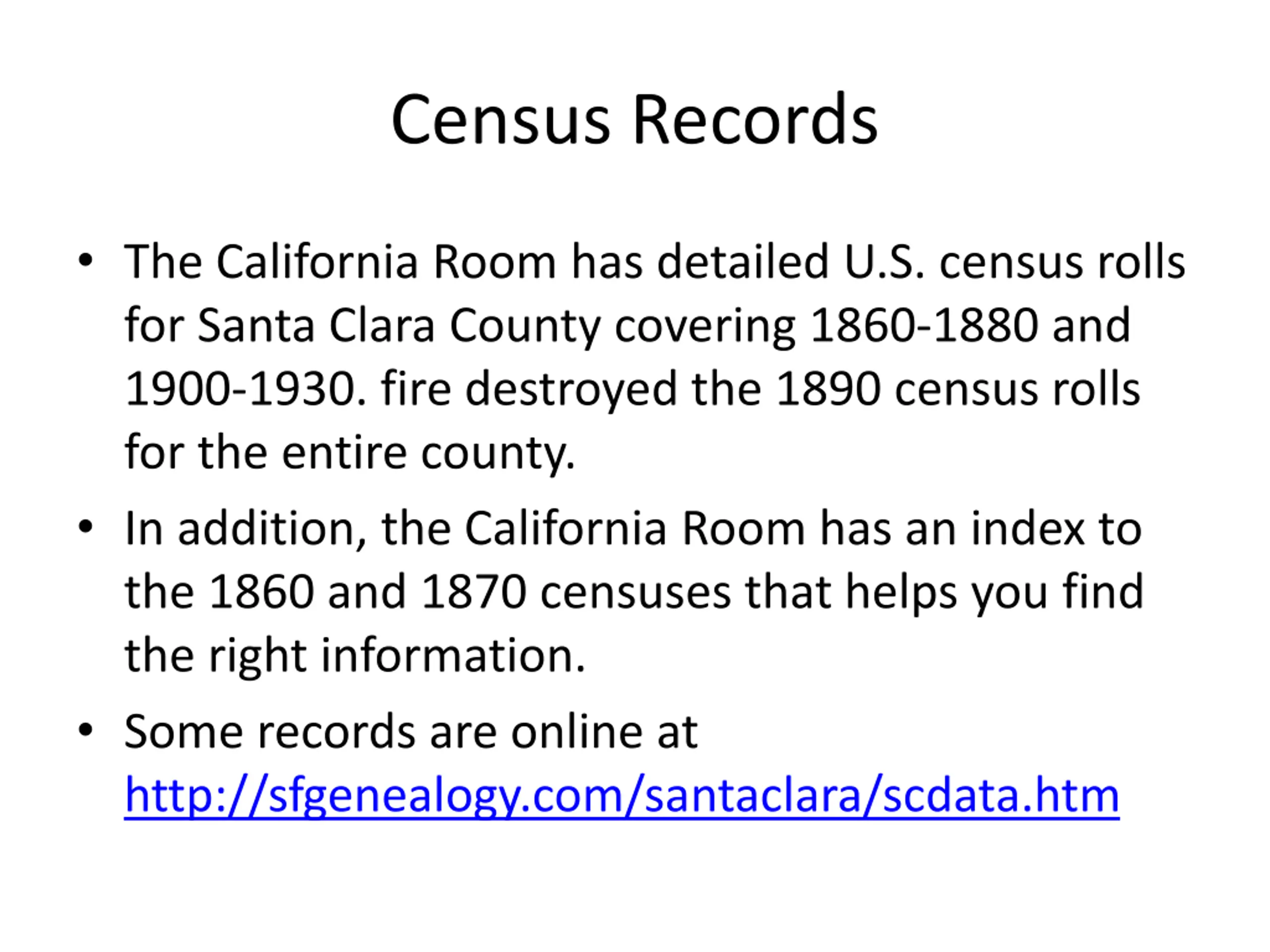 Census Records The California Room has detailed U.S. census rolls for Santa Clara County covering 1860-1880 and 1900-1930. fire destroyed the 1890 census rolls for the entire county. In addition, the California Room has an index to the 1860 and 1870 censuses that helps you find the right information. Some records are online at http://sfgenealogy.com/santaclara/scdata.htm