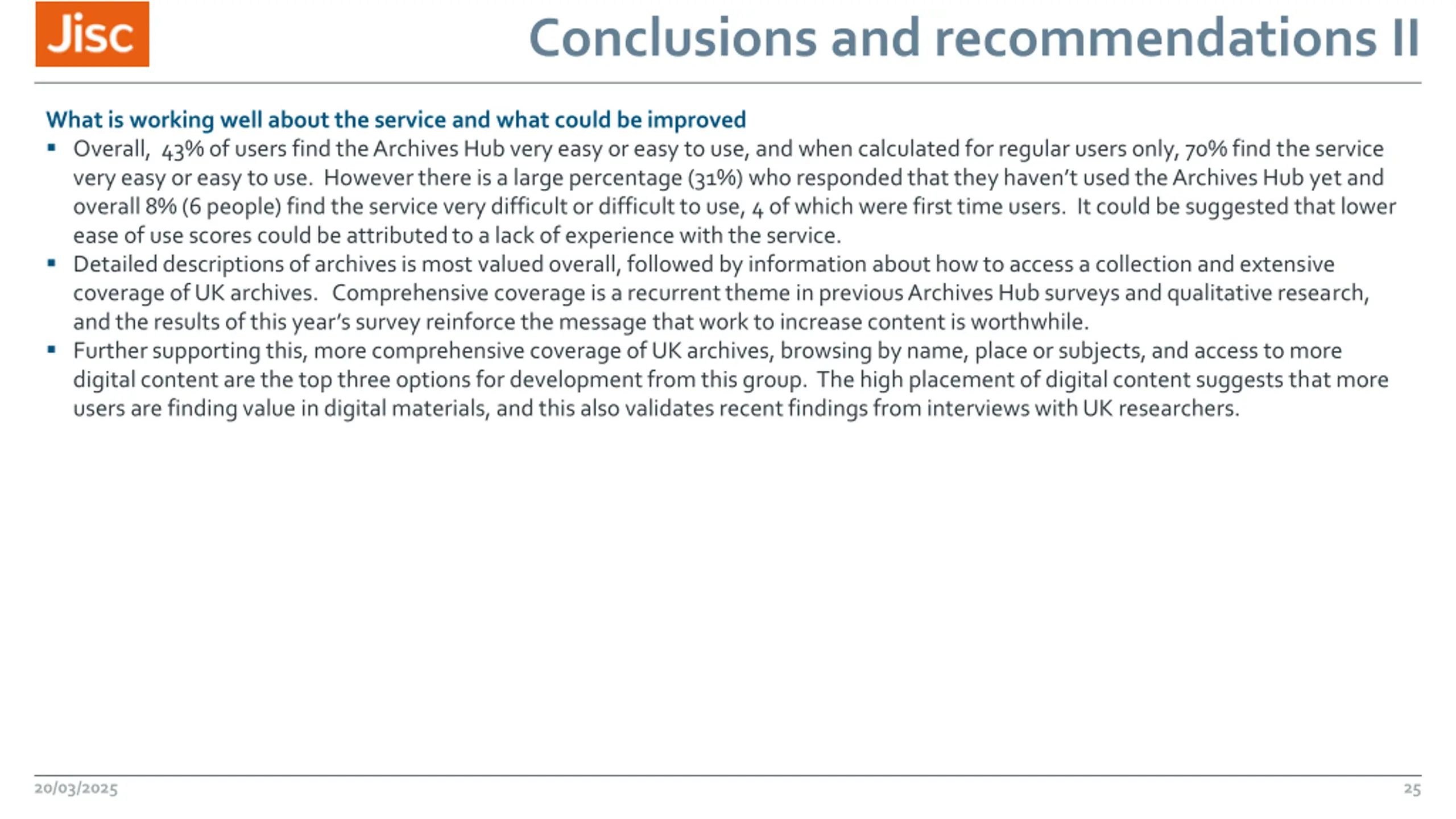 Conclusions and recommendations II What is working well about the service and what could be improved Overall, 43% of users find the Archives Hub very easy or easy to use, and when calculated for regular users only, 70% find the service very easy or easy to use. However there is a large percentage (31%) who responded that they haven t used the Archives Hub yet and overall 8% (6 people) find the service very difficult or difficult to use, 4 of which were first time users. It could be suggested that lower ease of use scores could be attributed to a lack of experience with the service. Detailed descriptions of archives is most valued overall, followed by information about how to access a collection and extensive coverage of UK archives. Comprehensive coverage is a recurrent theme in previous Archives Hub surveys and qualitative research, and the results of this year s survey reinforce the message that work to increase content is worthwhile. Further supporting this, more comprehensive coverage of UK archives, browsing by name, place or subjects, and access to more digital content are the top three options for development from this group. The high placement of digital content suggests that more users are finding value in digital materials, and this also validates recent findings from interviews with UK researchers. 20/03/2025 25