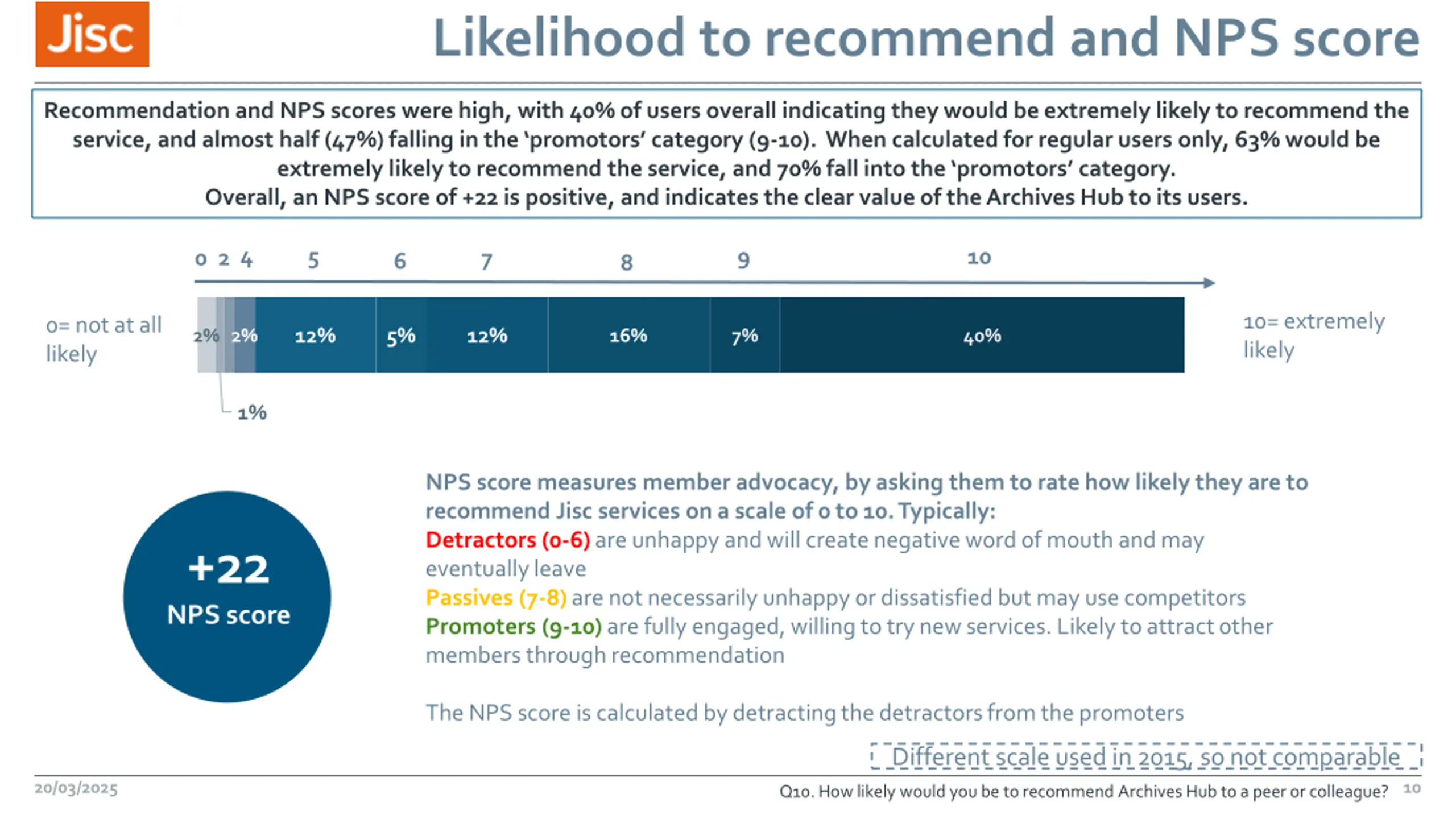 Likelihood to recommend and NPS score Recommendation and NPS scores were high, with 40% of users overall indicating they would be extremely likely to recommend the service, and almost half (47%) falling in the promotors category (9-10). When calculated for regular users only, 63% would be extremely likely to recommend the service, and 70% fall into the promotors category. Overall, an NPS score of +22 is positive, and indicates the clear value of the Archives Hub to its users. 0 2 4 5 10 9 7 6 8 10= extremely likely 0= not at all likely 12% 5% 12% 2% 2% 16% 7% 40% 1% NPS score measures member advocacy, by asking them to rate how likely they are to recommend Jisc services on a scale of 0 to 10. Typically: Detractors (0-6) are unhappy and will create negative word of mouth and may eventually leave Passives (7-8) are not necessarily unhappy or dissatisfied but may use competitors Promoters (9-10) are fully engaged, willing to try new services. Likely to attract other members through recommendation +22 NPS score The NPS score is calculated by detracting the detractors from the promoters Different scale used in 2015, so not comparable 20/03/2025 10 Q10. How likely would you be to recommend Archives Hub to a peer or colleague?