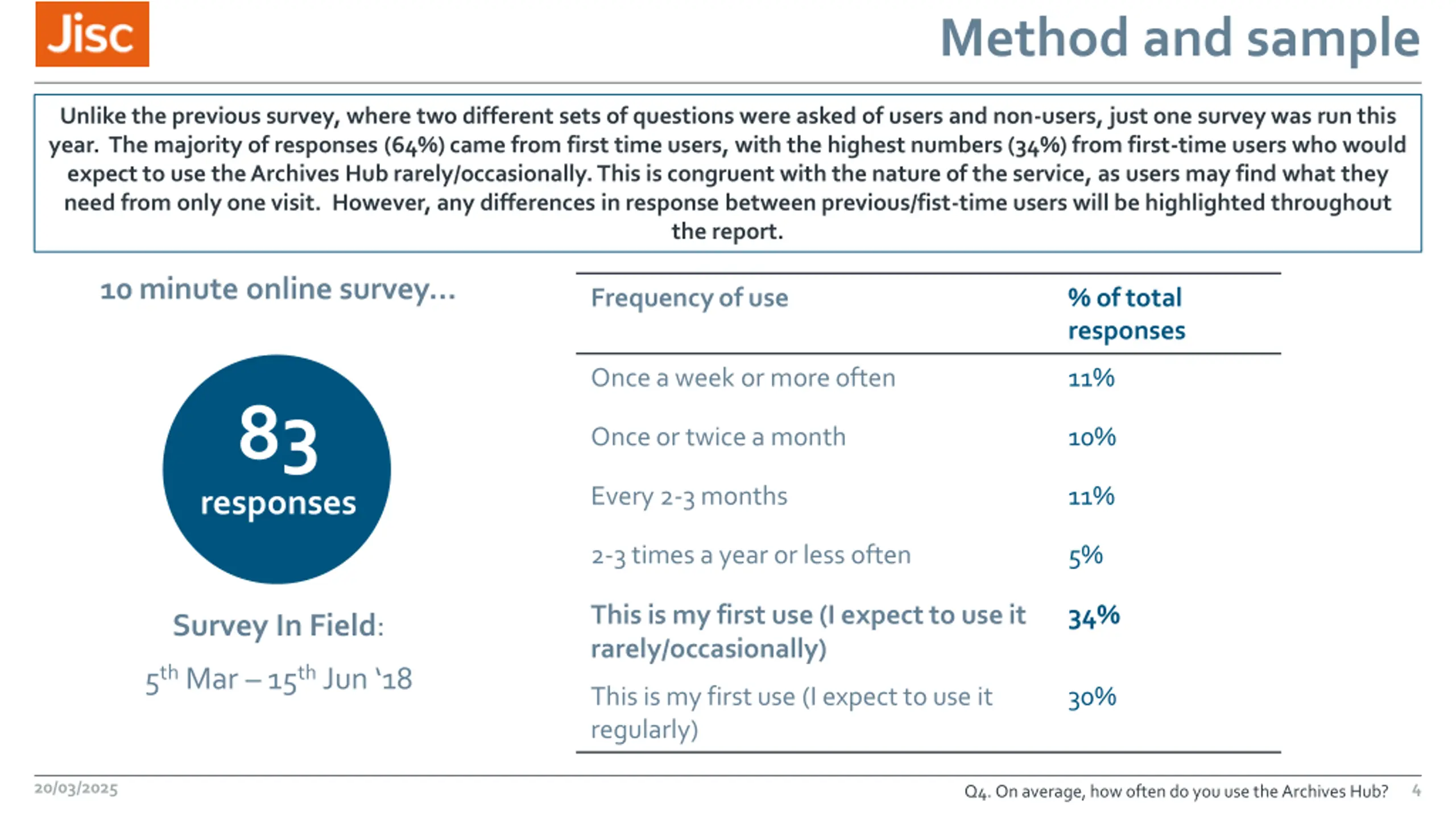 Background and objectives Background The Archives Hub brings together descriptions of thousands of the UK s archive collections. Representing over 330 institutions across the country, the service is an effective way to discover unique and often little-known sources to support research. Overall Objective To inform ongoing developments of the Archives Hub. Core Research Objectives Understand the profile of users of the service and any difference in experience by user group Explore frequency of use of the service and rationale for use Understand overall service satisfaction Understand what is working well about the service and what could be improved The last user survey for the Archives Hub was conducted in 2015, and therefore a new survey was needed to review current satisfaction and needs for the service. 20/03/2025 3