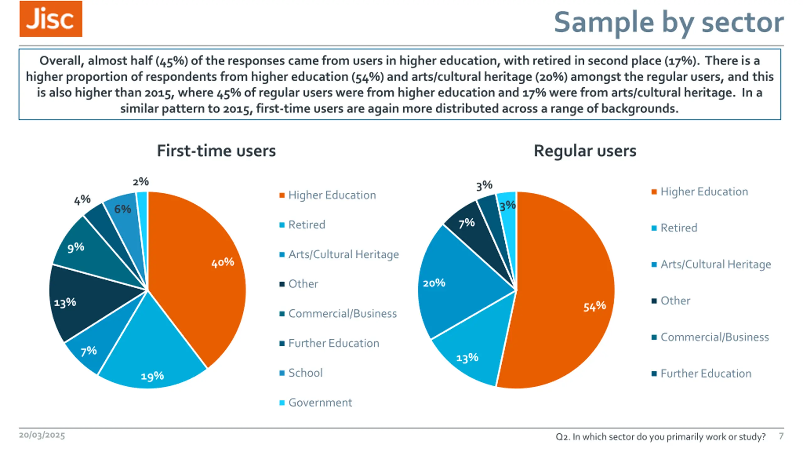 Sample by sector Overall, almost half (45%) of the responses came from users in higher education, with retired in second place (17%). There is a higher proportion of respondents from higher education (54%) and arts/cultural heritage (20%) amongst the regular users, and this is also higher than 2015, where 45% of regular users were from higher education and 17% were from arts/cultural heritage. In a similar pattern to 2015, first-time users are again more distributed across a range of backgrounds. First-time users Regular users 2% 0%3% Higher Education Higher Education 4% 3% 6% 7% Retired Retired 9% Arts/Cultural Heritage 40% Arts/Cultural Heritage 20% Other Other 13% 54% Commercial/Business Commercial/Business Further Education 7% 13% School Further Education 19% Government 20/03/2025 7 Q2. In which sector do you primarily work or study?