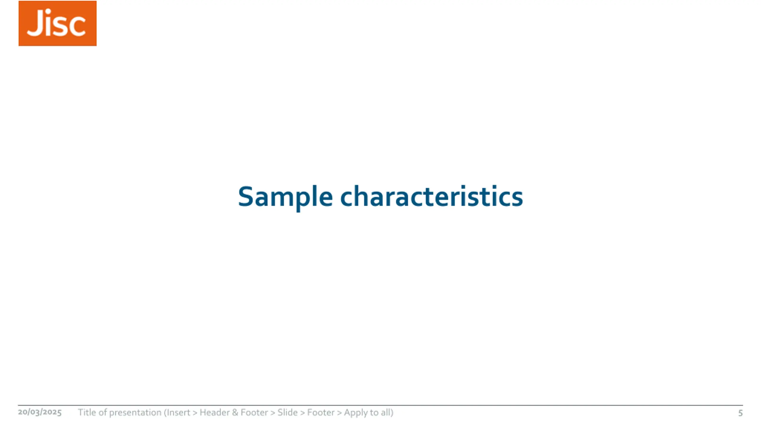 Sample characteristics 20/03/2025 5 Title of presentation (Insert > Header & Footer > Slide > Footer > Apply to all)