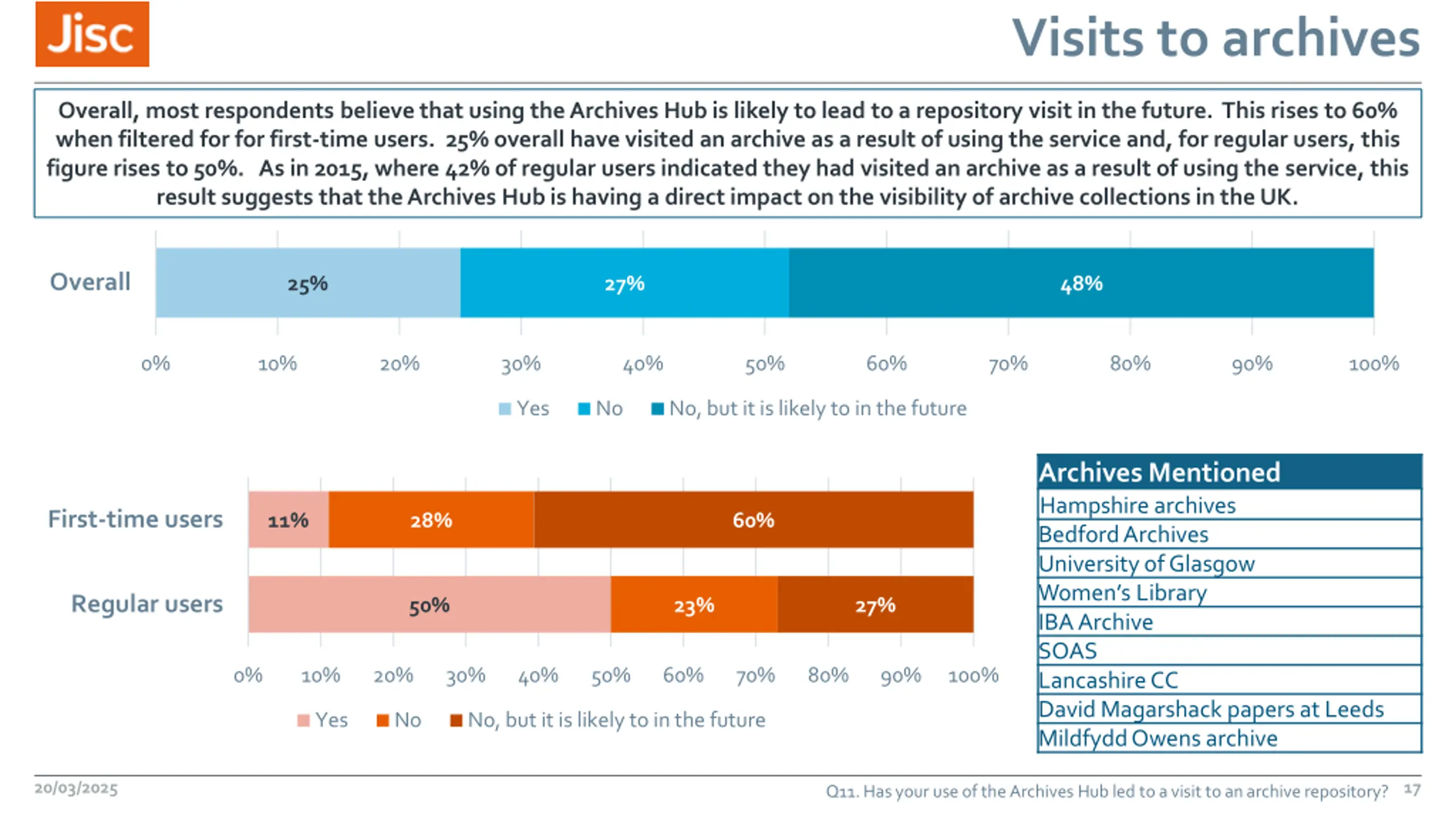 Visits to archives Overall, most respondents believe that using the Archives Hub is likely to lead to a repository visit in the future. This rises to 60% when filtered for for first-time users. 25% overall have visited an archive as a result of using the service and, for regular users, this figure rises to 50%. As in 2015, where 42% of regular users indicated they had visited an archive as a result of using the service, this result suggests that the Archives Hub is having a direct impact on the visibility of archive collections in the UK. Overall 25% 27% 48% 0% 10% 20% 30% 40% 50% 60% 70% 80% 90% 100% Yes No No, but it is likely to in the future Archives Mentioned Hampshire archives Bedford Archives University of Glasgow Women s Library IBA Archive SOAS Lancashire CC David Magarshack papers at Leeds Mildfydd Owens archive First-time users 11% 28% 60% Regular users 50% 23% 27% 0% 10% 20% 30% 40% 50% 60% 70% 80% 90% 100% Yes No No, but it is likely to in the future 20/03/2025 17 Q11. Has your use of the Archives Hub led to a visit to an archive repository?