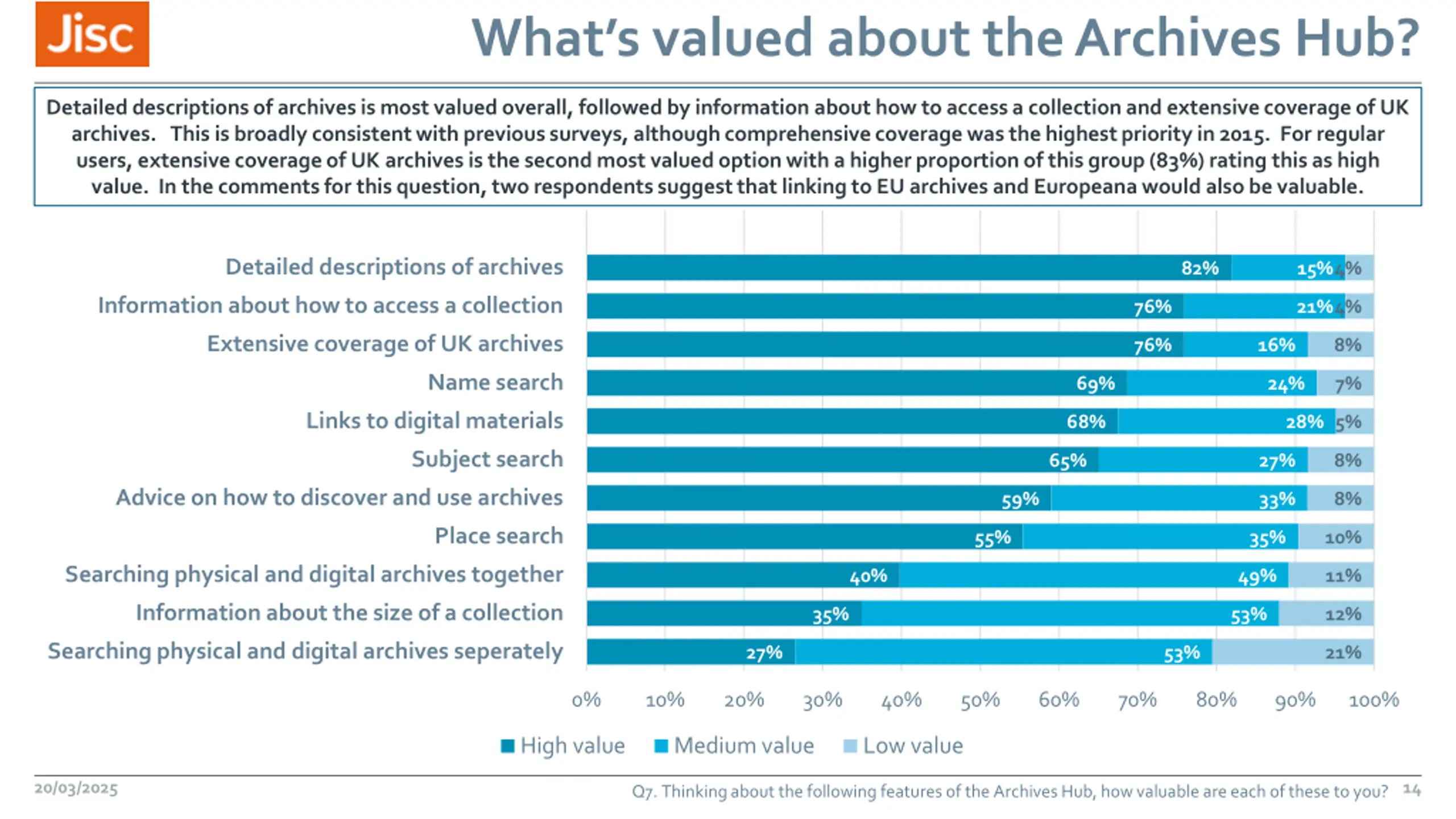 Whats valued about the Archives Hub? Detailed descriptions of archives is most valued overall, followed by information about how to access a collection and extensive coverage of UK archives. This is broadly consistent with previous surveys, although comprehensive coverage was the highest priority in 2015. For regular users, extensive coverage of UK archives is the second most valued option with a higher proportion of this group (83%) rating this as high value. In the comments for this question, two respondents suggest that linking to EU archives and Europeana would also be valuable. Detailed descriptions of archives 82% 15% 4% Information about how to access a collection 76% 21% 4% Extensive coverage of UK archives 76% 16% 8% Name search 69% 24% 7% Links to digital materials 68% 28% 5% Subject search 65% 27% 8% Advice on how to discover and use archives 59% 33% 8% Place search 55% 35% 10% Searching physical and digital archives together 40% 49% 11% Information about the size of a collection 35% 53% 12% Searching physical and digital archives seperately 27% 53% 21% 0% 10% 20% 30% 40% 50% 60% 70% 80% 90% 100% High value Medium value Low value 20/03/2025 14 Q7. Thinking about the following features of the Archives Hub, how valuable are each of these to you?