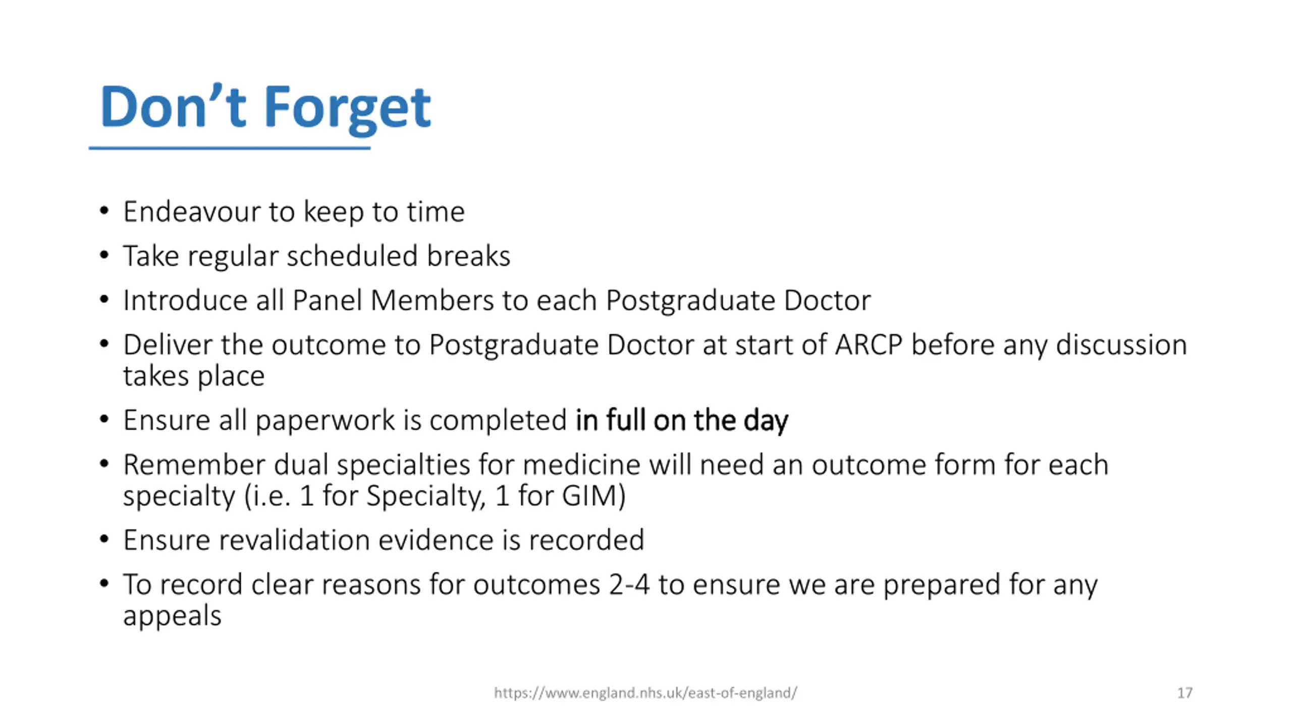 How the ARCP Should Run The Deanery Assessment Administrator will arrange for Postgraduate Doctor receiving an adverse outcome, to join the virtual panel. In this case the panel should review the evidence and decide the outcome before admitting the trainee to the virtual meeting. Panel Members must introduce themselves to the Postgraduate Doctor After this, the Postgraduate Doctor should be informed of the outcome recommended by the panel it is not a process of negotiation it is not a process of negotiation If you wish to clarify anything with a Postgraduate Doctor invite them in, discuss, then send out again while you deliberate https://www.england.nhs.uk/east-of-england/ 14