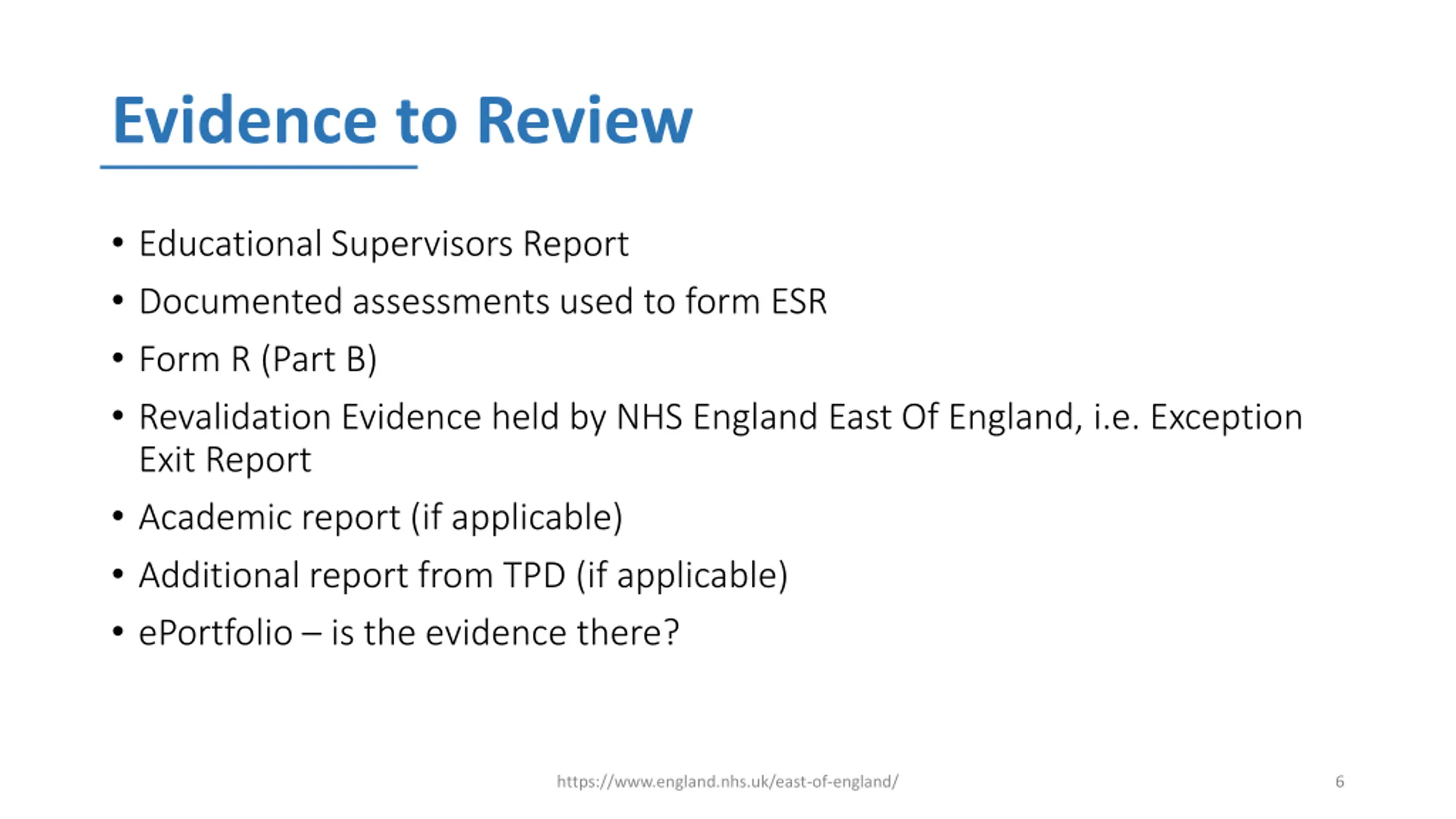 Evidence to Review Educational Supervisors Report Documented assessments used to form ESR Form R (Part B) Revalidation Evidence held by NHS England East Of England, i.e. Exception Exit Report Academic report (if applicable) Additional report from TPD (if applicable) ePortfolio is the evidence there? https://www.england.nhs.uk/east-of-england/ 6