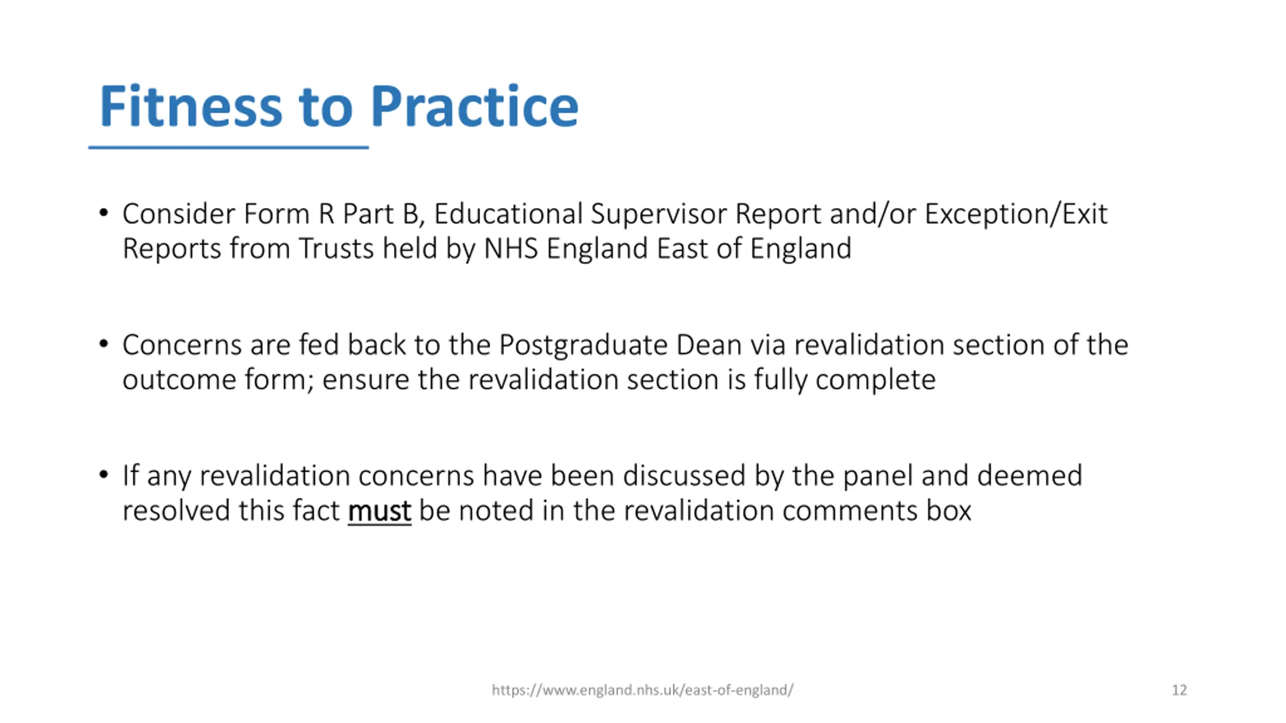 Fitness to Practice Consider Form R Part B, Educational Supervisor Report and/or Exception/Exit Reports from Trusts held by NHS England East of England Concerns are fed back to the Postgraduate Dean via revalidation section of the outcome form; ensure the revalidation section is fully complete If any revalidation concerns have been discussed by the panel and deemed resolved this fact must must be noted in the revalidation comments box https://www.england.nhs.uk/east-of-england/ 12