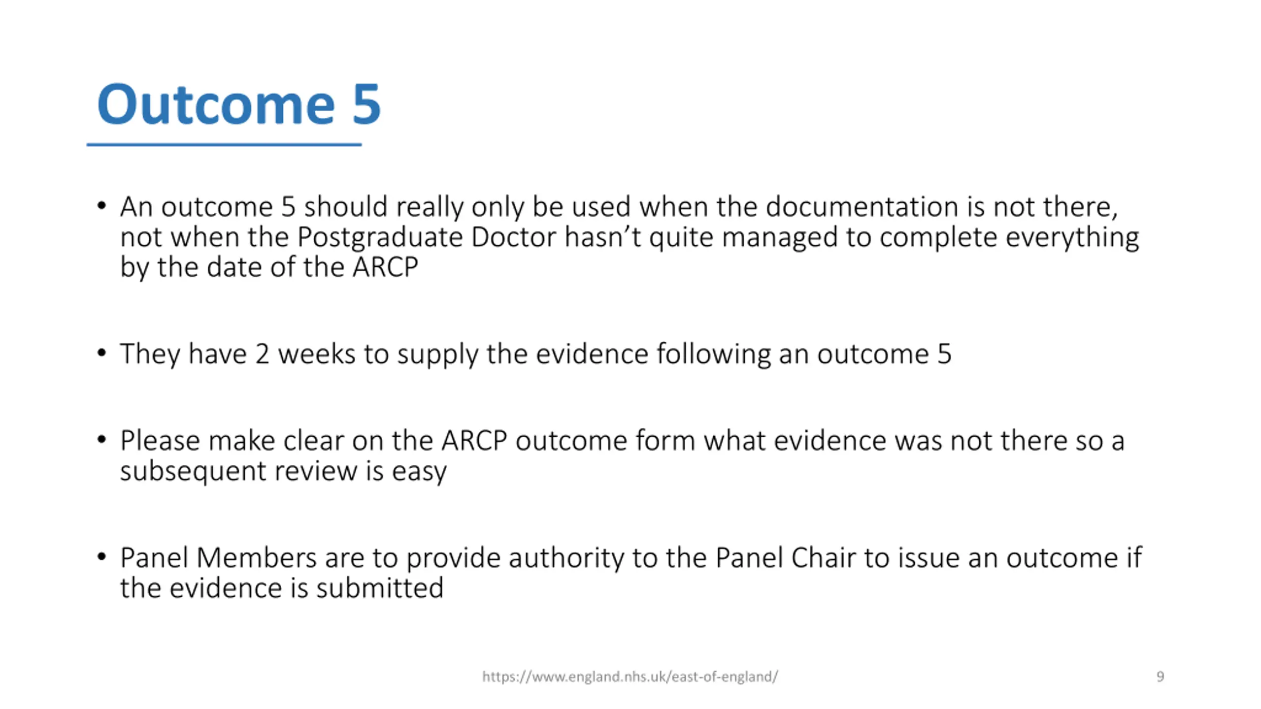 Outcome 5 An outcome 5 should really only be used when the documentation is not there, not when the Postgraduate Doctor hasn t quite managed to complete everything by the date of the ARCP They have 2 weeks to supply the evidence following an outcome 5 Please make clear on the ARCP outcome form what evidence was not there so a subsequent review is easy Panel Members are to provide authority to the Panel Chair to issue an outcome if the evidence is submitted https://www.england.nhs.uk/east-of-england/ 9