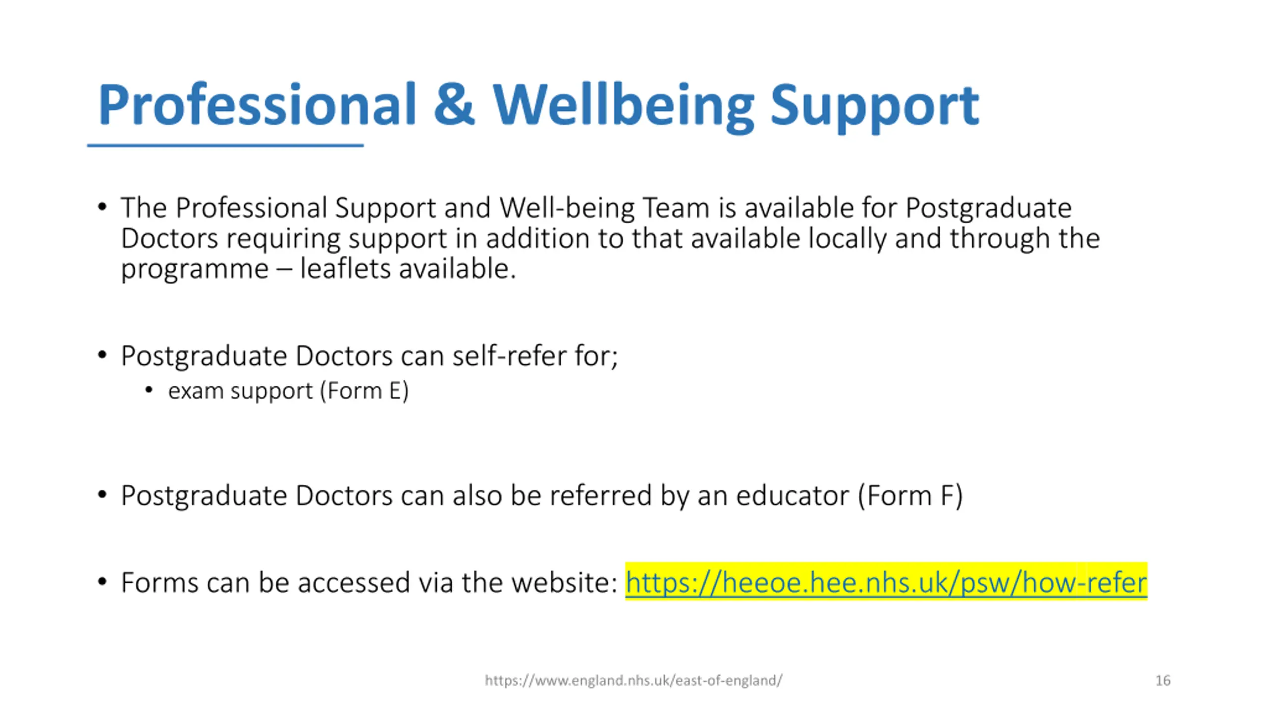 Professional & Wellbeing Support The Professional Support and Well-being Team is available for Postgraduate Doctors requiring support in addition to that available locally and through the programme leaflets available. Postgraduate Doctors can self-refer for; exam support (Form E) Postgraduate Doctors can also be referred by an educator (Form F) Forms can be accessed via the website: https://heeoe.hee.nhs.uk/psw/how-refer https://www.england.nhs.uk/east-of-england/ 16