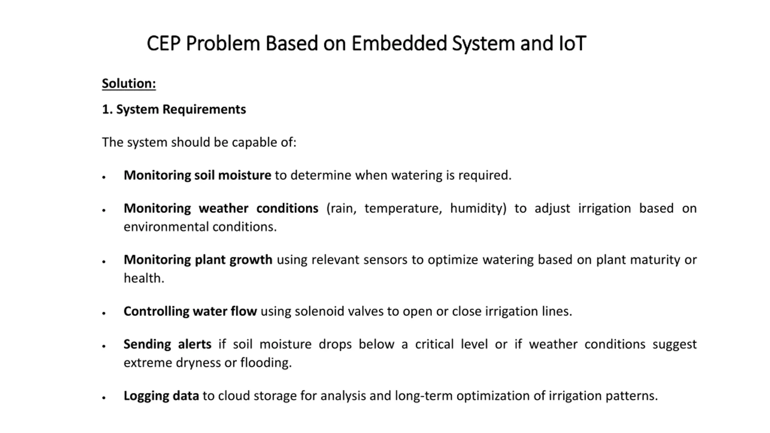 CEP Problem Based on Embedded System and IoT CEP Problem Based on Embedded System and IoT Solution: 1. System Requirements The system should be capable of: Monitoring soil moisture to determine when watering is required. Monitoring weather conditions (rain, temperature, humidity) to adjust irrigation based on environmental conditions. Monitoring plant growth using relevant sensors to optimize watering based on plant maturity or health. Controlling water flow using solenoid valves to open or close irrigation lines. Sending alerts if soil moisture drops below a critical level or if weather conditions suggest extreme dryness or flooding. Logging data to cloud storage for analysis and long-term optimization of irrigation patterns.