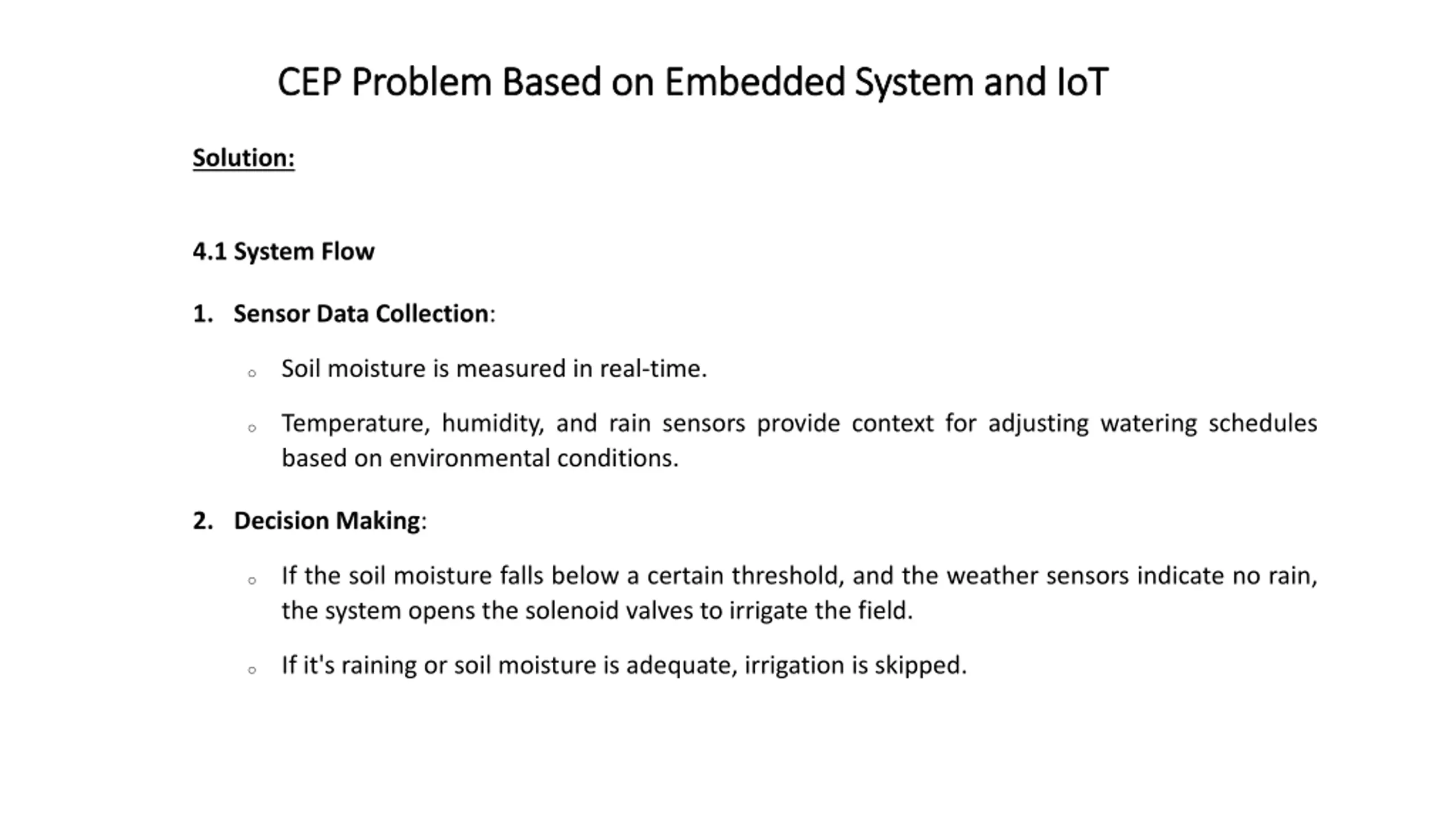 CEP Problem Based on Embedded System and IoT CEP Problem Based on Embedded System and IoT Solution: 4.1 System Flow 1. Sensor Data Collection: Soil moisture is measured in real-time. o Temperature, humidity, and rain sensors provide context for adjusting watering schedules based on environmental conditions. o 2. Decision Making: If the soil moisture falls below a certain threshold, and the weather sensors indicate no rain, the system opens the solenoid valves to irrigate the field. o If it's raining or soil moisture is adequate, irrigation is skipped. o